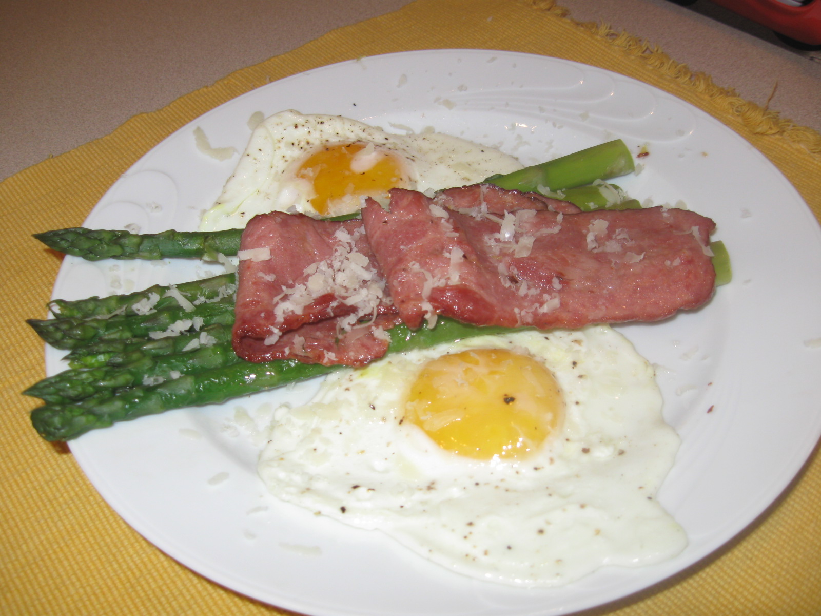 How to make: To prepare the asparagus, put a little water in a big, and deep pan. Remove the yellowish and hard edges of the asparagus and wash. Put the asparagus (as much as you like) in the pan and cook covered for about 6 minutes. When ready, remove from the pan and keep in a dish. In the same pan, fry the bacon until crispy. You don’t need to grease the pan to cook the alreayd pretty fat bacon. When ready, remove it and place it in a dish. Vicky doesn’t give instructions for the eggs. From her photo, I gather, she heats the oil well before cracking the eggs in. That way they become more crispy. To get them to look like in my photo, crack the eggs in before the oil is too hot. Sprinkle salt and pepper to taste. When the white part has become white, use a tablespoon to ladle some hot oil over the yolk. Do that several times until the yolk forms a very thin whitish membrane. Assemble the dish anyway you like and serve with grated parmesan. I prefer the arrangement in Vicky’s version but I was too quick to lay the eggs first on the plate and too lazy to change the arrangement.