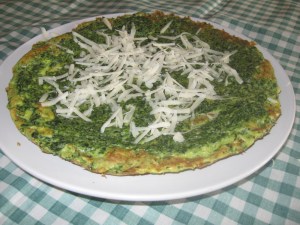 How to make: Saute the onion, add the spinach and 2-3 cubes of frozen basil and saute for about 5 more minutes. If you use fresh basil add it after the spinach is sauteed. Add salt, pepper, oregano and saute 1-2 minutes more. Add well beaten eggs after you have mixed them with the Parmesan. Give them a nice and gentle stir until they are well mixed with the spinach. Let the food cook on low heat. Use a silicon spatula to check if the egg-spinach mix has firmed at the rims. Slide the spatula a little beneath the egg-spinach mix to be sure the bottom is firm. When the bottom and sides are firm place the pan in pre-heated broil (low heat). Place the pan on a rack in the oven just below the grill but make sure there’s some distance between the top of the pan and the grill. Cook until the top is firm. You can leave it a little longer if you prefer it crispier. But don’t overcook and don’t let it go dark brown. The one I’m showing in the photo is brown enough already.