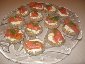 Vicky is my constant source of inspiration these days. So, you’ll get to see more references and links to her recipes during the holiday. Did I tell you that after my daughter’s Xmas cookies party on Saturday, we had our very good friends over for dinner? Well, we did and I had to divide my time wisely between preparing the lamb dish and the welcome appetizer. I hope Vicky will forgive me for changing her recipe so much. I’ll try it to the letter another time and share a post. This time, I’m offering you the speediest ever appetizing bites with salmon, cream cheese and toasted bread. The cookie cutters that were lying in my kitchen provided the inspiration for giving the bread their decorated round shape.