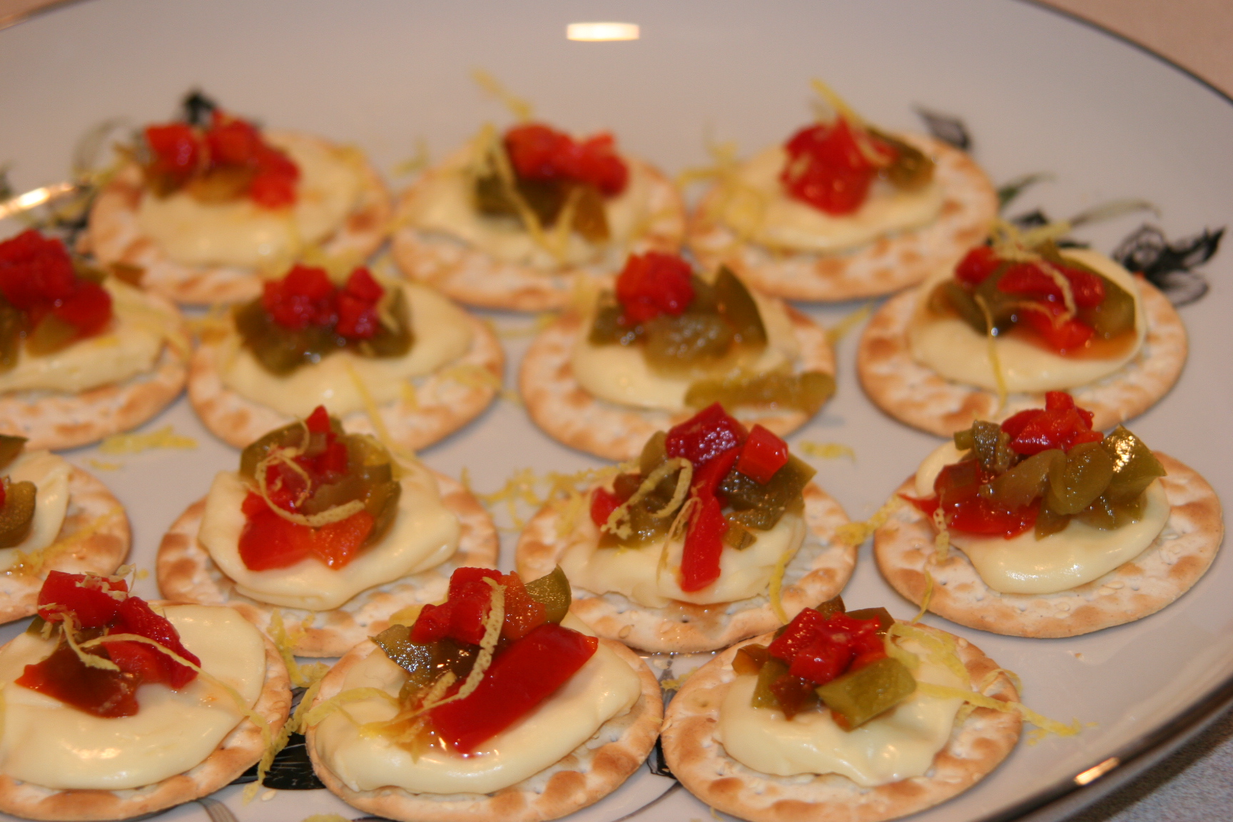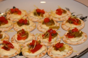 Welcome your guests with these beautiful appetizers. Spread brie, camembert or plain cream cheese on crackers and top with red pepper relish and lemon zest. Here’s in translation Vicky’s recipe for red pepper relish.