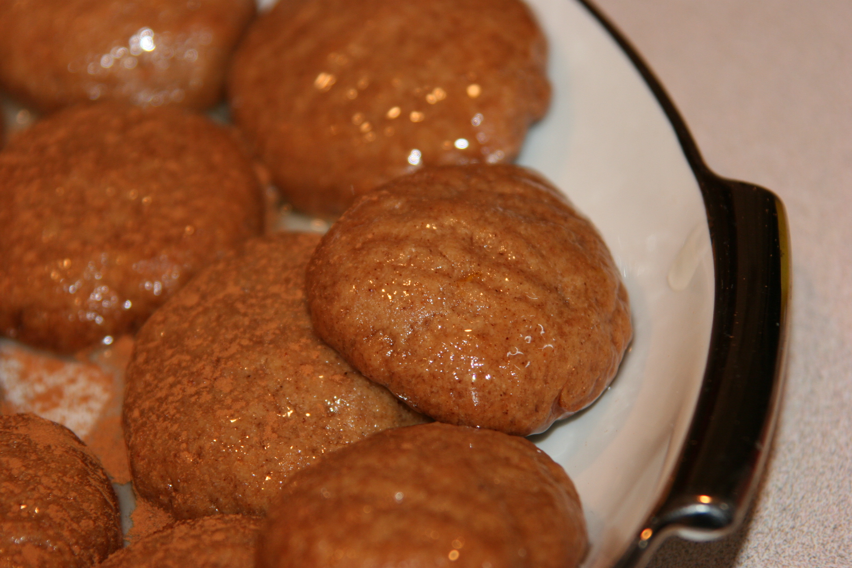 “Melomakarona” are traditional Christmas treats in Greece made with oil, flour and cinnamon. The traditional recipe calls for nuts but in our house we have a nut allergy so we make a nut free version. I got the basic recipe from Vicky. Here you can see what they’d look like with the beautiful nut toppings.