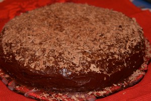 How to make: Mix all the frosting ingredients using a food mixer with a whisk  in this order: slightly cooled off melted chocolate + butter+syrup + vanilla extract + sour cream + confectioner’s sugar.  You can add drops of hot water or more confectioner’s sugar if needed to make the mix thick enough but also soft enough for spreading.  Place the first layer of the cake on a serving dish. Spread approximately 1/3 frosting on top. Put the second layer on top. Spread another 1/3 of the frosting on top. Using the last 1/3 to cover the sides. In my cake I ‘shaved’ some chocolate on top for decoration.