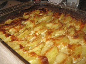 How to make: Choose small size potatoes. Peel them and cut them as you can see in the photo. Arrange them in a pan, partially overlapping.  Add salt and pepper. Pour heavy cream on top. Enough to see that the bottom is all covered generously  but not so much that the potatoes are swimming in it. Add garlic and quite a bit of nutmeg. Nutmeg is great in this recipe. Err on putting more.  Sprinkle cheese on top and cook in pre-heated 400 F or 200 C oven for about an hour or until the potatoes acquire the look in the photo 🙂