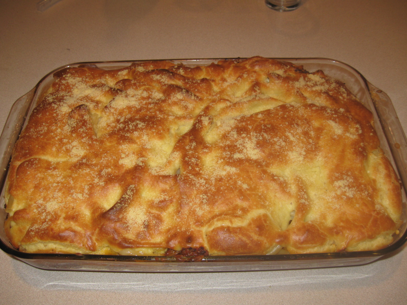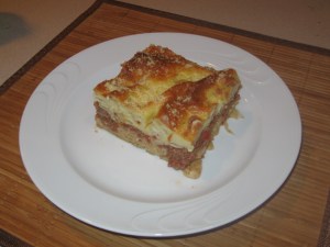 How to make:  Cook the past a  in boiling and salted water according to package instructions. Strain and rinse with cold water. Set aside. In big saucepan, saute the onions first, then add the meat and saute until it turns brown (stir with a wooden spoon). Add the wine if you want and cook for a few more minutes. Add salt, pepper, oregano. Then add the crushed tomatoes and the cinnamon sticks and cook at low heat for half an hour. After both the pasta and the meat sauce are ready, get started with the bechamel. Heat the butter in a pot at low heat. At low heat! Add flour and mix using a whisk. Using a whisk! That’s all you need to do to be sure there will be no lumps. Use a whisk. Add a little salt and pepper. Then gradually add the heated milk and stir vigorously using the whisk. Take the bechamel off the heat when it’s become nice and creamy. Add Parmesan and the eggs lightly beaten. Now, off to arrange all in a pan.  Spread a layer of pasta. Sprinkle with Paremesan. Add the meat sauce as another layer. Add remaining pasta as a third layer. Then spread the bechamel evenly on top and sprinkle some more Parmesan on top. That’s it! Cook in pre-heated 375 F oven for about 45 minutes or until the top is brown (see photo).