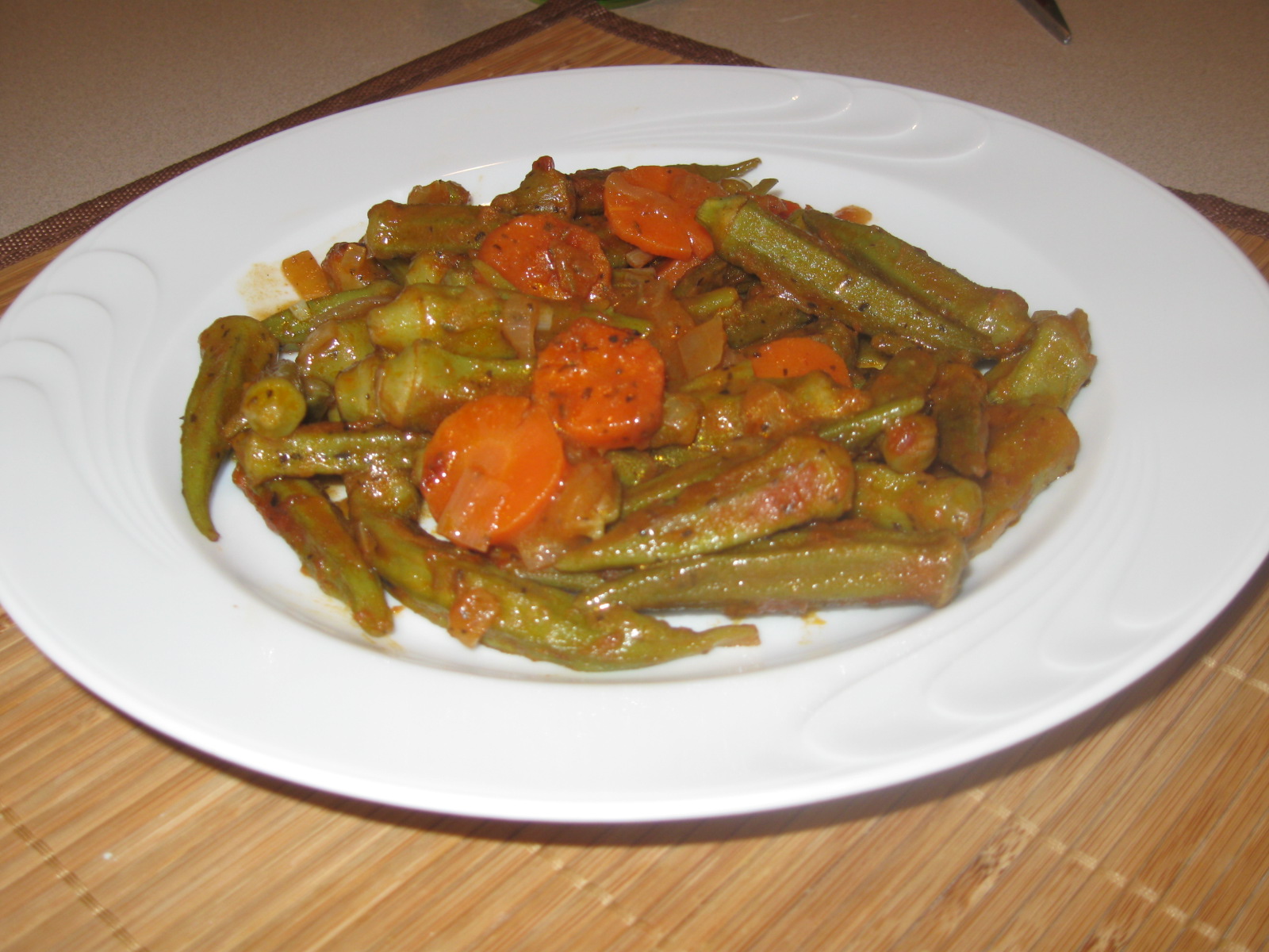How to make: Heat the oil in a deep pan and saute the onions and carrots. Add tomato sauce and keep cooking for about 10 minutes or less (more if the carrots are not thinly sliced). Add the okra, stirring very softly just once to cover them somewhat with the sauce. Let them saute for about 5 minutes with the sauce. Add salt, pepper and mint (generously but don’t over do it, check the taste). Add water to barely cover the okra. Cover the pan and cook for about 20-25 minutes or until okra is tender. Add water as needed. You can leave as much or as little water as you like. In my family, we don’t like it watery as you can see in the photo.