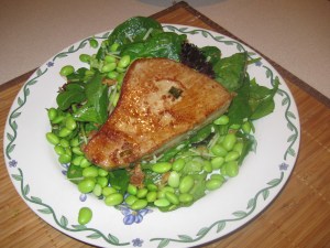 This is a `recycle’ recipe. Check the `Ahi tuna and chopped salad‘ for how to cook the Ahi tuna fillets. As for the greens, this time I served the tuna fillets with mixed greens, vinaigrette and plenty of edamame (great fiber food). I get frozen bags of edamame from Trader Joe’s. I take them out of the freezer in the morning before I leave home and they’re ready when we’re all back home for dinner.