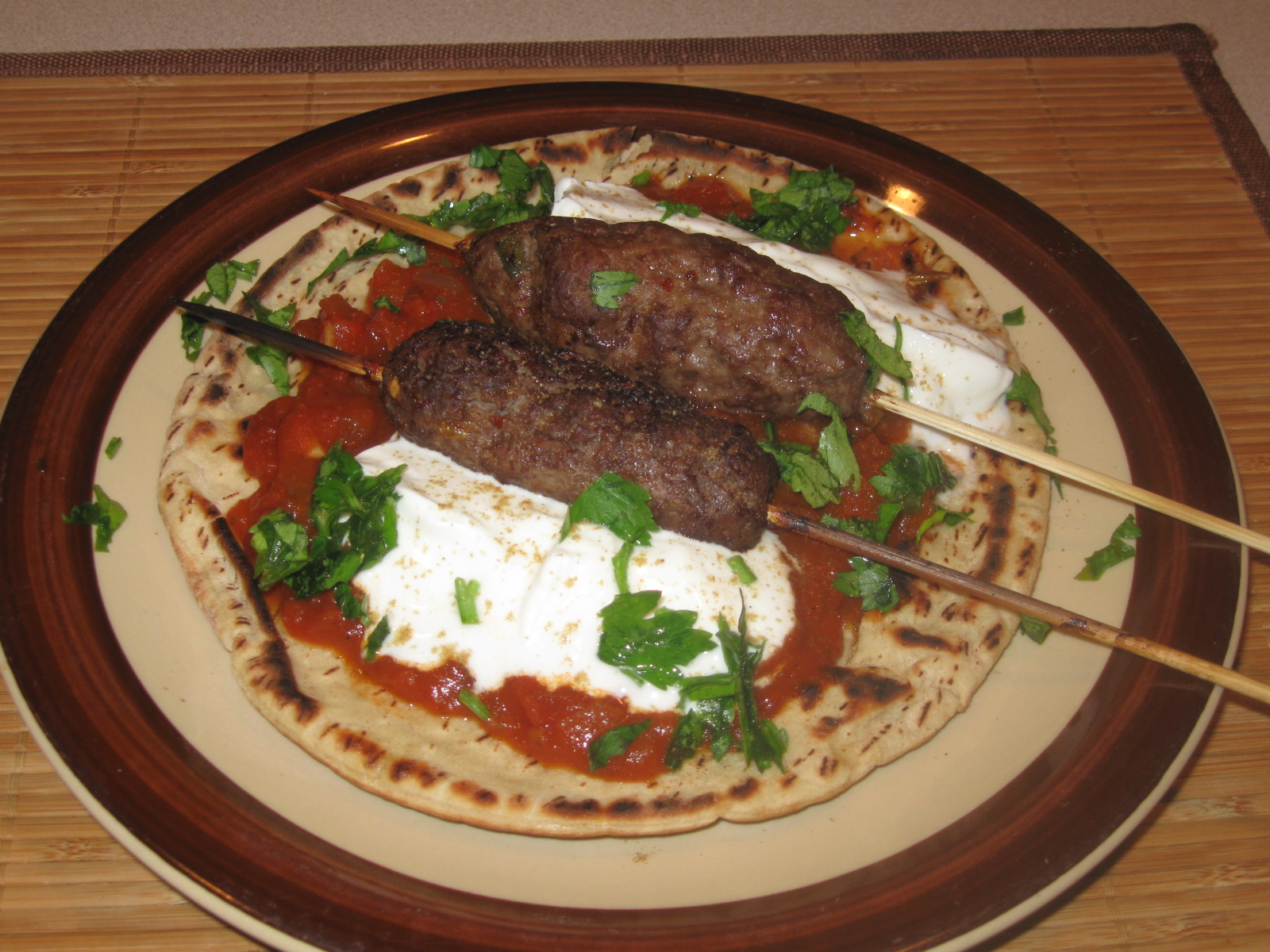 How to make: Mix all the kebab ingredients and knead well. Put in the fridge and let it stand for couple of hours. I had prepared the meat the night before to have it ready when I needed it. To make the sauce: saute the onions for a few minutes or until they become transparent. Add the garlic and saute a bit more (don’t burn it). Add the remaining tomato sauce ingredients and cook for about 45 minutes or until the sauce thickens and you get nice slightly chunky texture. I had also prepared the sauce the night before. Before dinner time, put the meat in skewers, as shown in the photo, and grill them. I grilled them on high and placed the grill dish just above the middle of the oven. Turn the kebab until it’s evenly brown. In the meantime, sprinkle some water on the pitta bread and spread a little olive oil on each side. I cooked the pitta bread on a stove top grill pan. To serve: place a pitta bread on a dish. Spread tomato sauce. Place two kebabs in the middle and yogurt at the sides. Top with parsley and ground cumin (or ground sweet red pepper but I didn’t have any). Let your palate experience the oriental flavors. But don’t over do it. This is a ‘heavy’ dish.