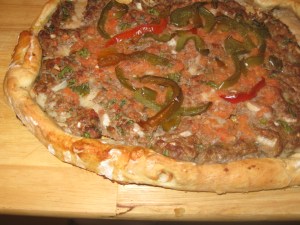 Ever since I made up a dish and named it after my daughter, “Melinakia”, my son kept asking for his own. I tried to stay within the same spirit, some kind of dough topped with a favorite ingredient and cooked in the oven. My son likes meat a lot so I knew the top would have to be meat. Minced meat makes good topping, I thought, maybe a little tomato, too. I searched for recipes with these ingredients. Then, I had to find some dough recipe. I didn’t want to use puff pastry again, like I did for “Melinakia”. The dish would be too similar and the meat would go well with a more substantial base, I thought. Click here, click there, and voila! “Thanasakia” came to life. Don’t be disheartened by the photo. This was my very first try and I was very indecisive. The boat shape was a last minute idea — I mean after the dough and toppings were in place — so I didn’t always have enough dough to make the right shape. Also, I spooned the remaining tomato sauce on top which was not such a great idea aesthetically and the peppers would be better off cubed. But, hey, there will be another time to perfect the edges. The family loved it! We ate it all, including the pizza-like experimental version you see at the bottom, in one evening. Maybe, it tasted too good, if you ask me. Or maybe we were way too hungry. Either way we ate more than we should. Now for the credits, to put this recipe together I used Mamalakis’ “pita me kima” recipe and for the dough I followed a recipe from “Syntages tis pareas“.