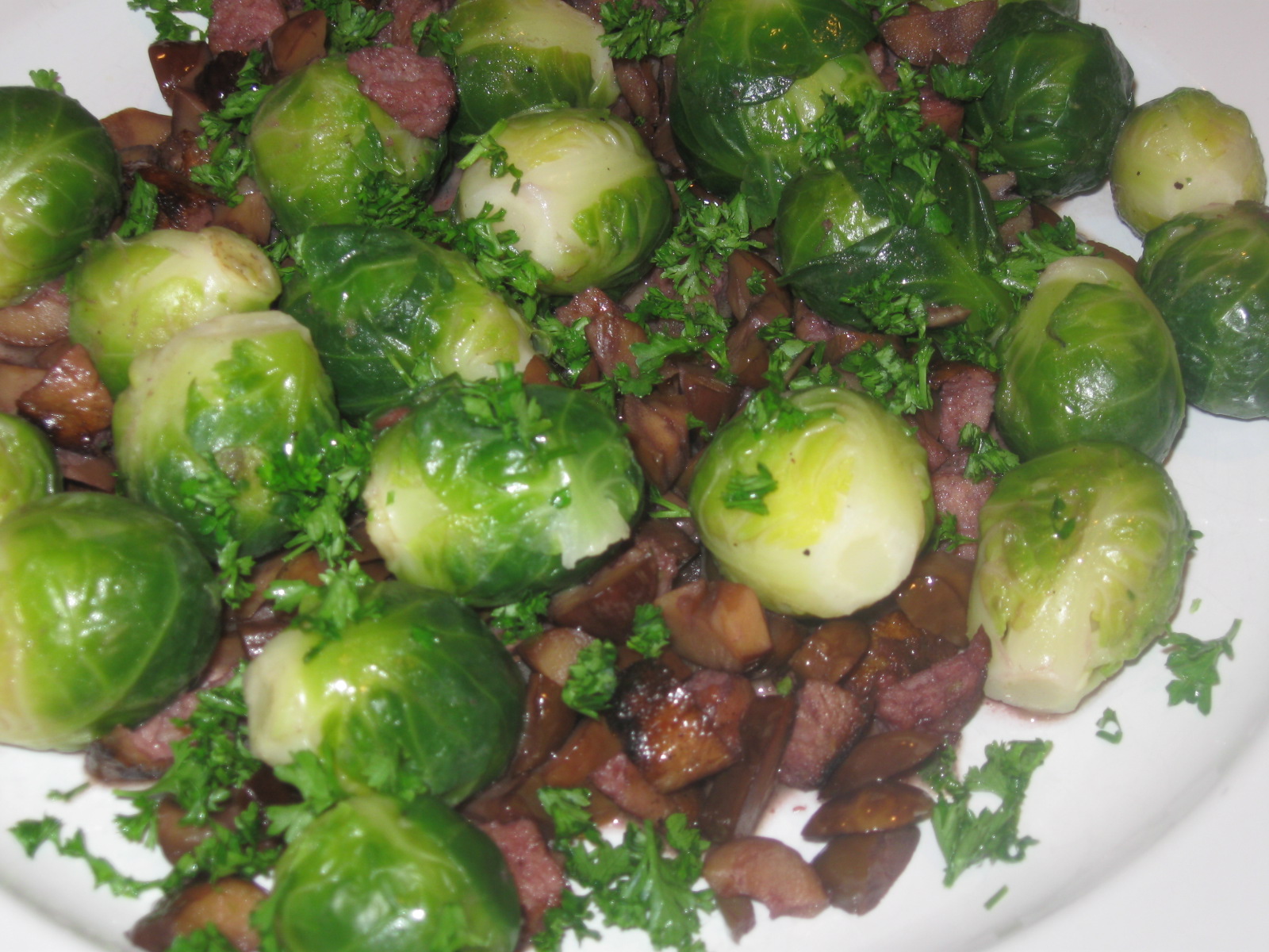 How to make: Boil Brussels sprouts in salted water at low heat until they are soft to the fork, about 7 -10 minutes. Drain and place in a bowl filled with ice cubes. Saute the sausage bits. Add the butter and the chestnuts and turn up the heat. Pour the wine and cook for a few more minutes. Add the Brussels sprouts and turn off the heat. Make sure they are well coated with the sausage mix. Add parsley and pepper and serve.