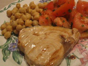 Buried in snow again and with the schools closed (the nightmare of the working parent), I have the quickest recipe for you today. Sword fish, grilled, and chick peas from a can.
