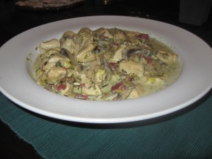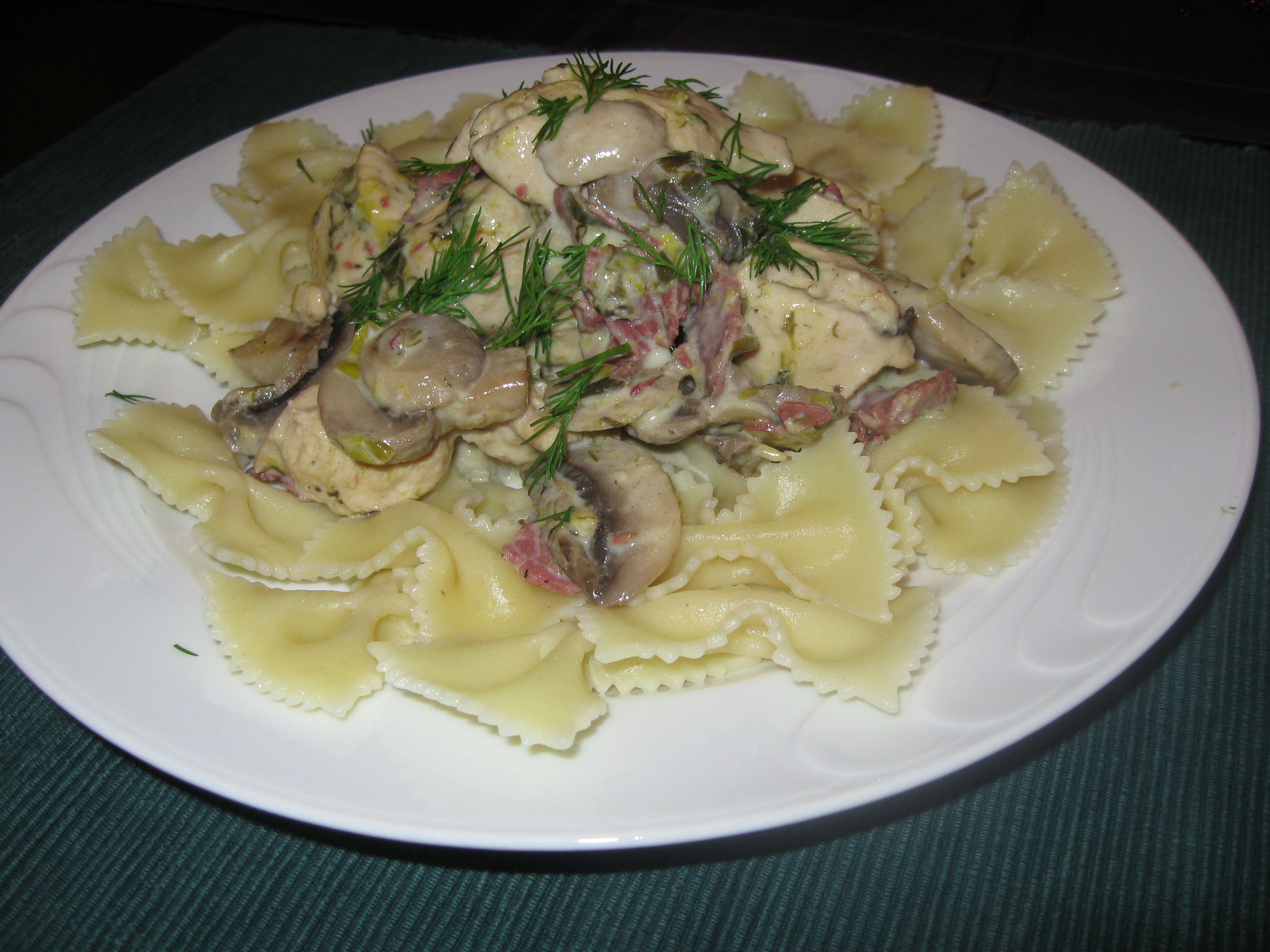 How to make: Heat the butter. Saute the bacon, the garlic and the leek, all at once. Add the chicken, mushrooms, bay leaves, salt and pepper. Lower the heat and cook covered for about an hour. When you are ready to serve, stir in heavy cream and cook for a few more minutes. Below you can see it served with pasta farfalle.