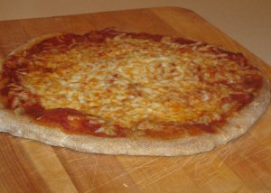 This is the speediest pizza ever. Fresh whole wheat pizza dough from Trader Joe’s, pizza tomato sauce from Trader Joe’s again and shredded mozzarella for the top. About 40 minutes ina 425 F or 220 C oven. Done.