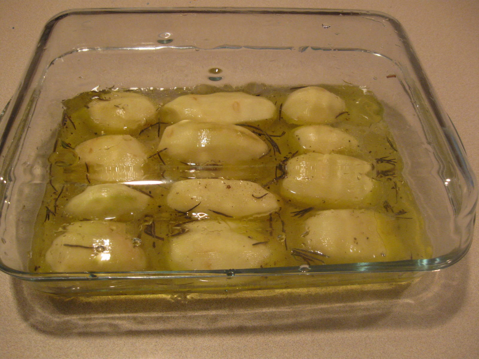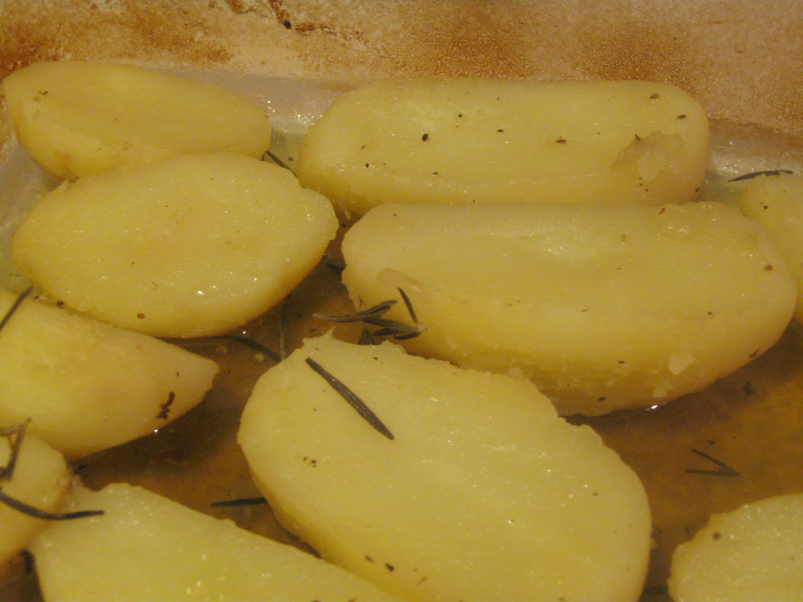 How to make: Peel the potatoes and cut them in half lengthwise. Arrange them in a pan (I like pyrex). Sprinkle salt and pepper (freshly ground preferably). Drizzle the oil on top and the lemon juice. Add the rosemary leaves. Fill with water to barely cover the potatoes. Bake them covered at 400F/200C for about an hour. In the photo below you see I have a special pair of pyrex pans that fit snugly (gastra). You can use aluminum foil to cover the pan. Be sure the potatoes do not run out of water entirely and there’s barely some liquid when done. Can you see how little liquid is  left in the pan in the photo above? If  the potatoes go darkish on top, flip them over while they’re still baking.