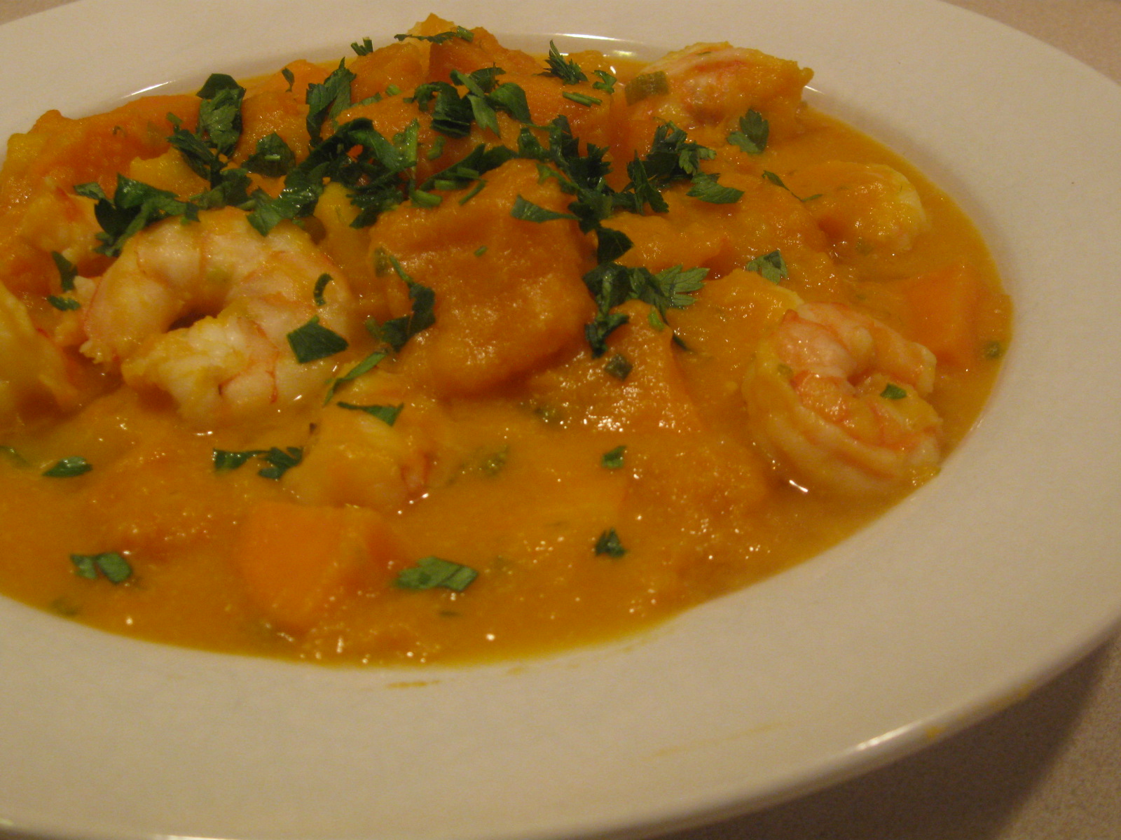 How to make: Saute the spring onion in the chile and canola oil. Add the coconut milk, chicken stock and fish sauce and bring to a boil. Add the butternut squash and sweet potato cubes and cook at low temperature for 15–20 minutes or until soft. Add the cleaned, washed and drained shrimp. When it comes to a boil again add the mango and lime juice and cook for a few more minutes until the shrimp is cooked. Sprinkle with chopped cilantro or parsley and serve on top of white rice.