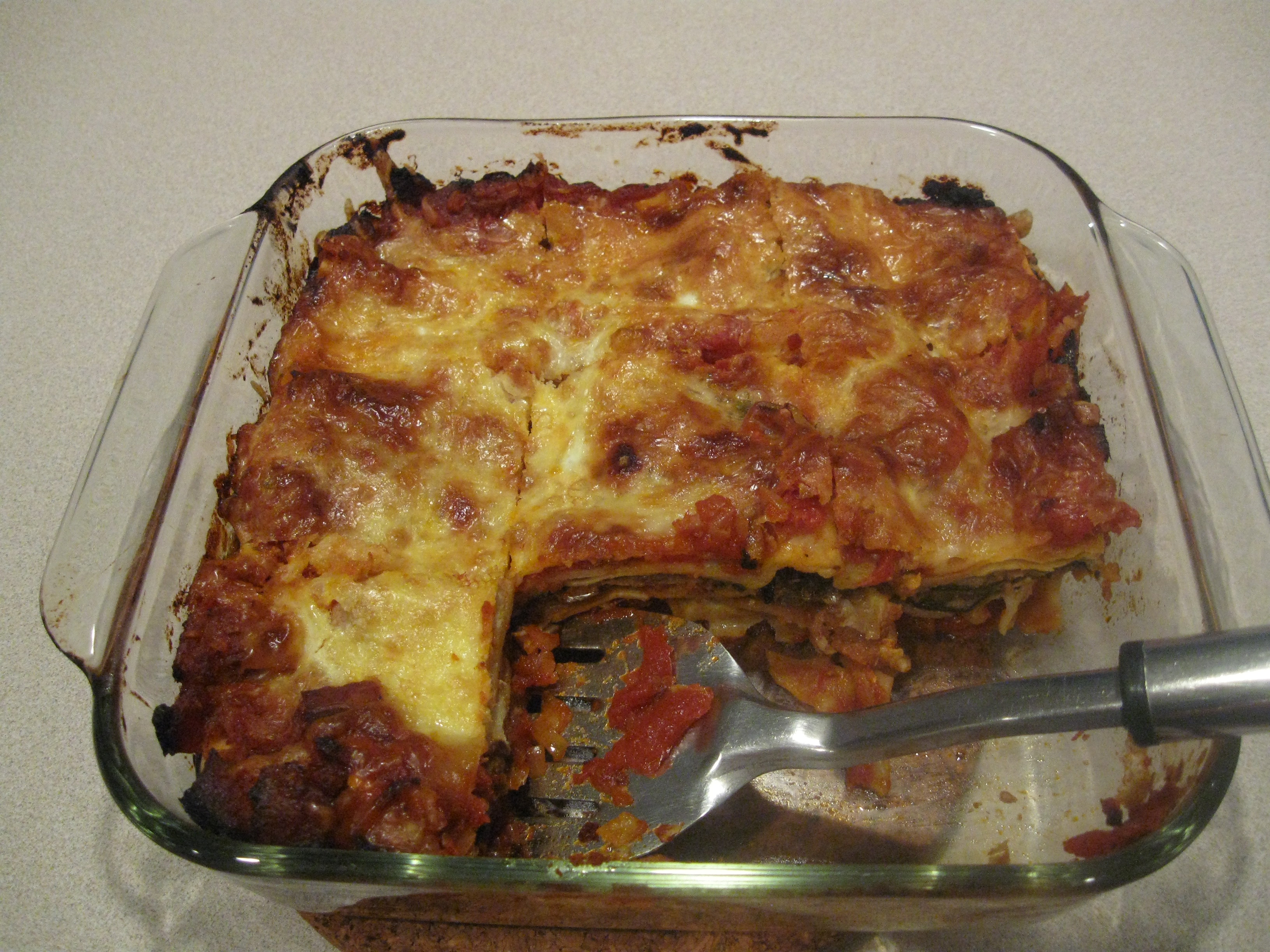 Notes and tips: This is the first time I’ve cooked no-cook lasagna. They were fine and a great time saver. No-cook lasagna means you don’t have to boil them first before you start making layers. They are available in most super-markets. The ones I used were the length of my pyrex and wider than 1/3 of the width of the pyrex, which means that the three lasagna noodles I used per layer were overlapping. If you can’t find them, use regular lasagna, instead, cooked according to package instructions.