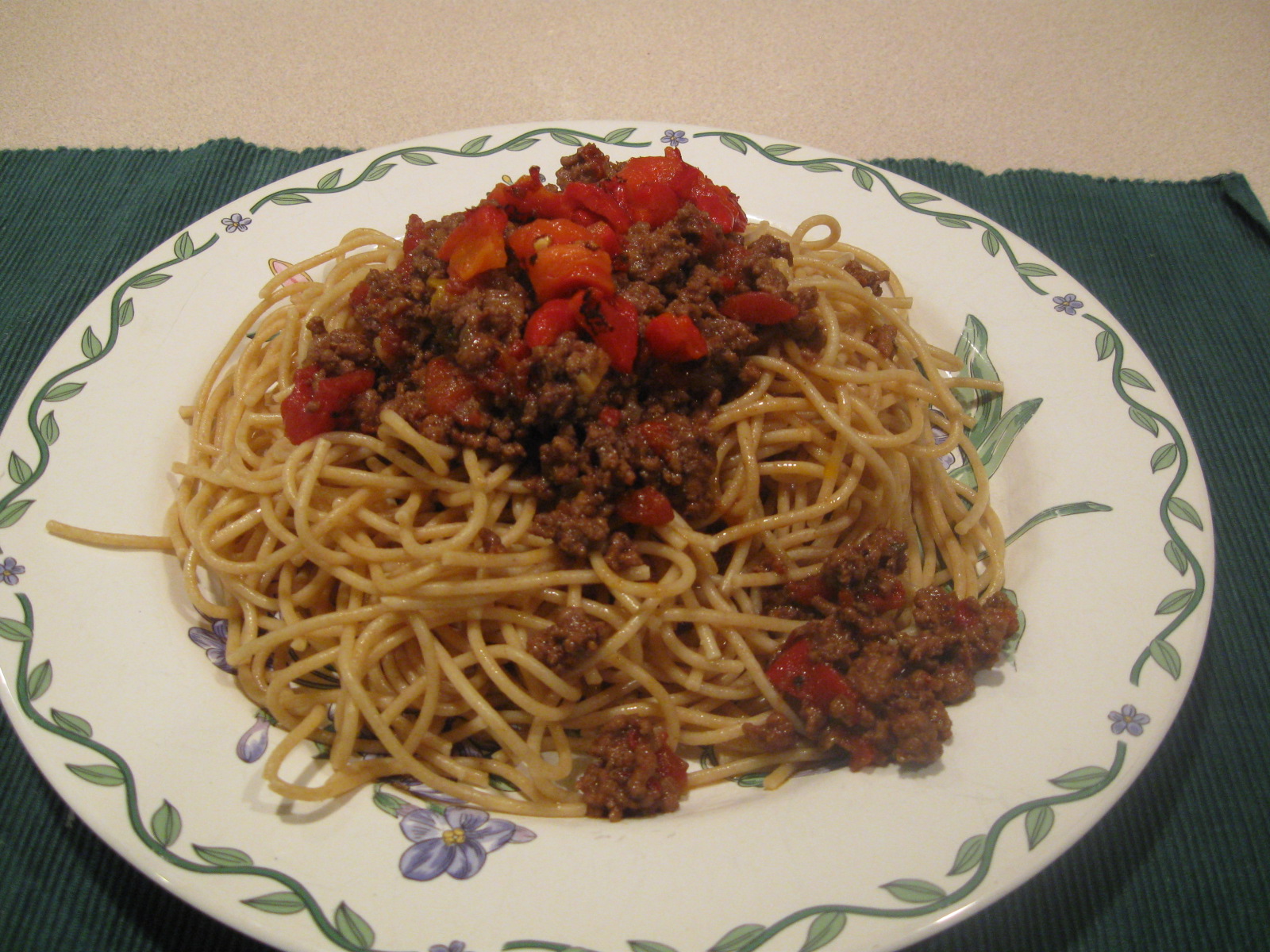 Notes and tips: The most important deviation from Vicky’s recipe is the peppers. Vicky doesn’ t use sweet roasted red peppers but my kids don’t like the food when it’s pepper kind of hot. So, I used roasted red peppers and only couple of regular pepper strips to give it just a little spark. Also, I saved some of the roasted red pepper cubes to add them on top when serving, as you can see in the photo. It looks good. I said it before, I’ll say it again, and again. Try whole wheat pasta instead of regular pasta, especially when you serve with strongly flavored meat sauces such as this one. It’s a much healthier choice and your kids may be fine with it. Don’t assume they won’t like it.