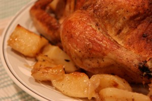 How to make: Wash the chicken thoroughly. Rub the inside and the outside of the chicken with salt, pepper and oregano. Sprinkle some lemon juice in the inside for extra flavor. Place in a pan, breast side up. Add the chopped onion at the bottom of the pan. Peel the potatoes and cut in desired shape. Arrange them around the chicken. On top of all, sprinkle salt, pepper, oregano, the juice from one lemon or maybe one and a half, and olive oil. Be sure the olive oil goes on the chicken. Add a cup of water and cook in 390F/200C over for about an hour and a half.