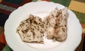 How to make: Clean the god fillets and rub them lightly with salt, pepper, thyme and marjoram. Put them in freezer bags if you have them. Use whatever pot you use to steam food and fill the bottom with a couple of inches water. Put the steamer tray in. When the pot is filled with steam, add the fish quickly, cover, turn off the heat and let it stand for about 10 minutes. Remove and serve with olive oil, lemon juice and lemon zest on top. I took the photo this morning when I removed the fish from the steamer so you can’t see the oil and lemon on top. I will add those in the evening when I serve the fish.
