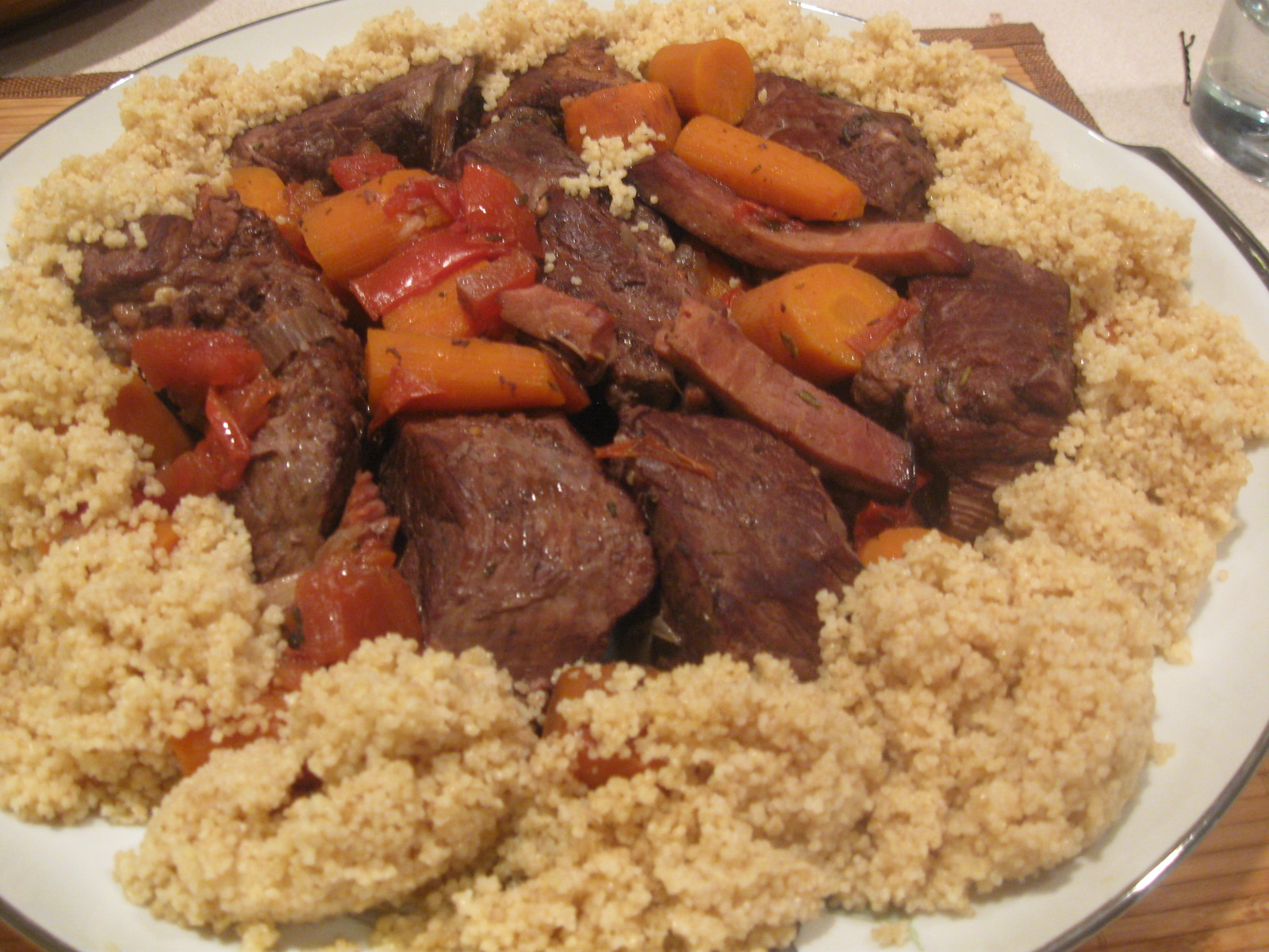 Done this before, right? This time I made it even simpler with what I had and didn’t have and served with couscous. It takes its time to cook but only half an hour to prepare and then you can forget the food in the oven. Mmmmm… just perfect! My favorite kind of recipe. The meat comes out so tender you cut it with your fork. What I had today was the right kind of meat, carrots, onion, garlic, bay leaves, thyme and, of course, red wine. What I didn’t have was cheese cloth to wrap the veggies and salt pork to make lardon. I let the veggies loose and sauteed strips of ham instead. The recipe below is how I made it yesterday, … or rather the night before.