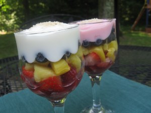 How to make: First make a strawberry layer and add 1 teaspoon pomegranate juice. I’m sure cranberry juice will also be fine. Make the strawberry layer your thickest. Add a layer of mango or pine apple chunks. Add a layer of blueberries. Add 2-3 tablespoons vanilla or strawberry yogurt. Top with seeds. I only had sesame seeds. You can see them in the photo below.