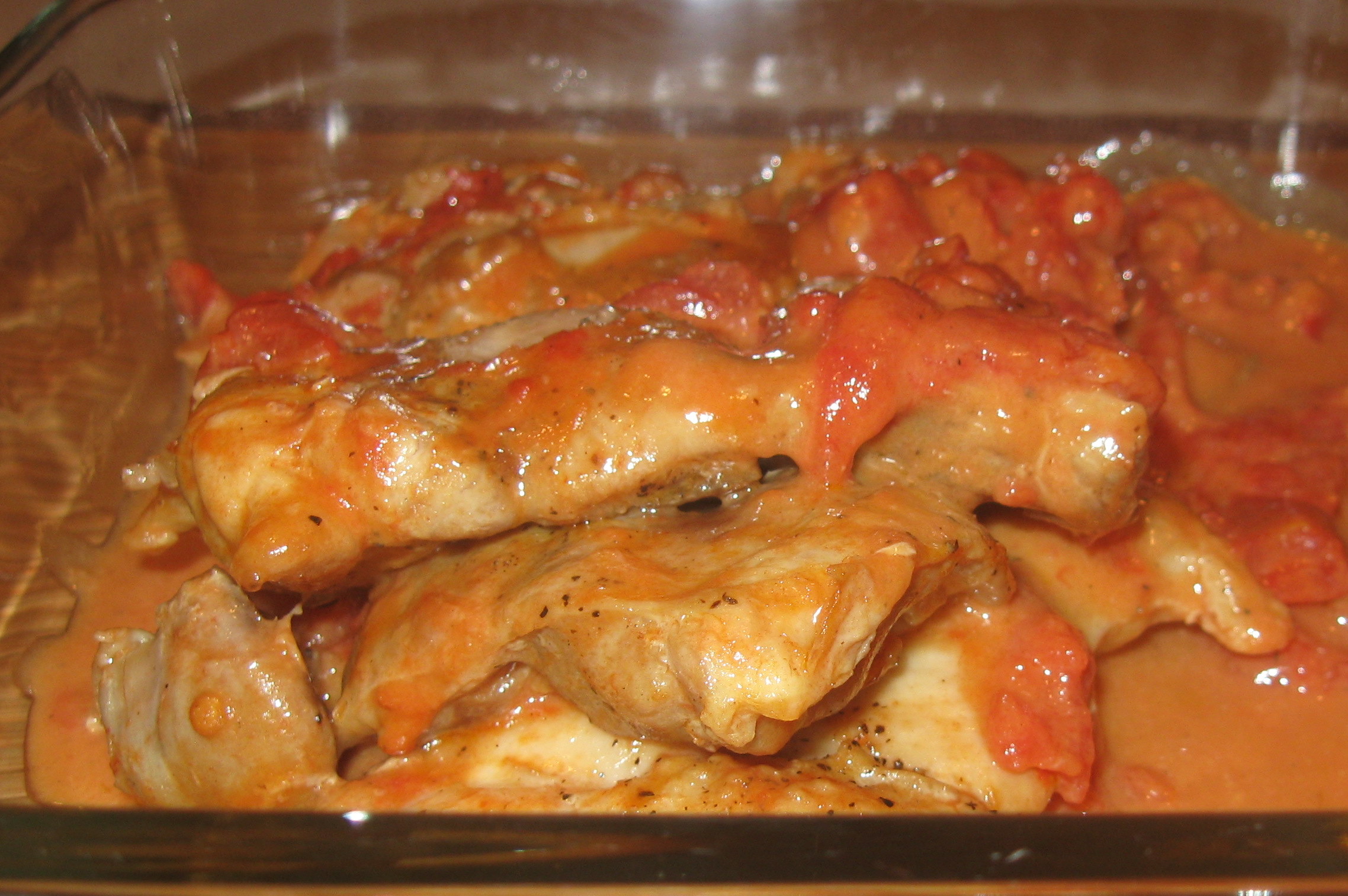 How to make: In a heavy skillet, heat the oil and saute the chicken on all sides. Add the wine and scrap the bottom to dissolve any hard parts in the liquid. Add the tomatoes, salt, pepper and bay leaves. Cover and cook for about 45 minutes. Check occasionally to be sure there’s enough liquid. Ready!