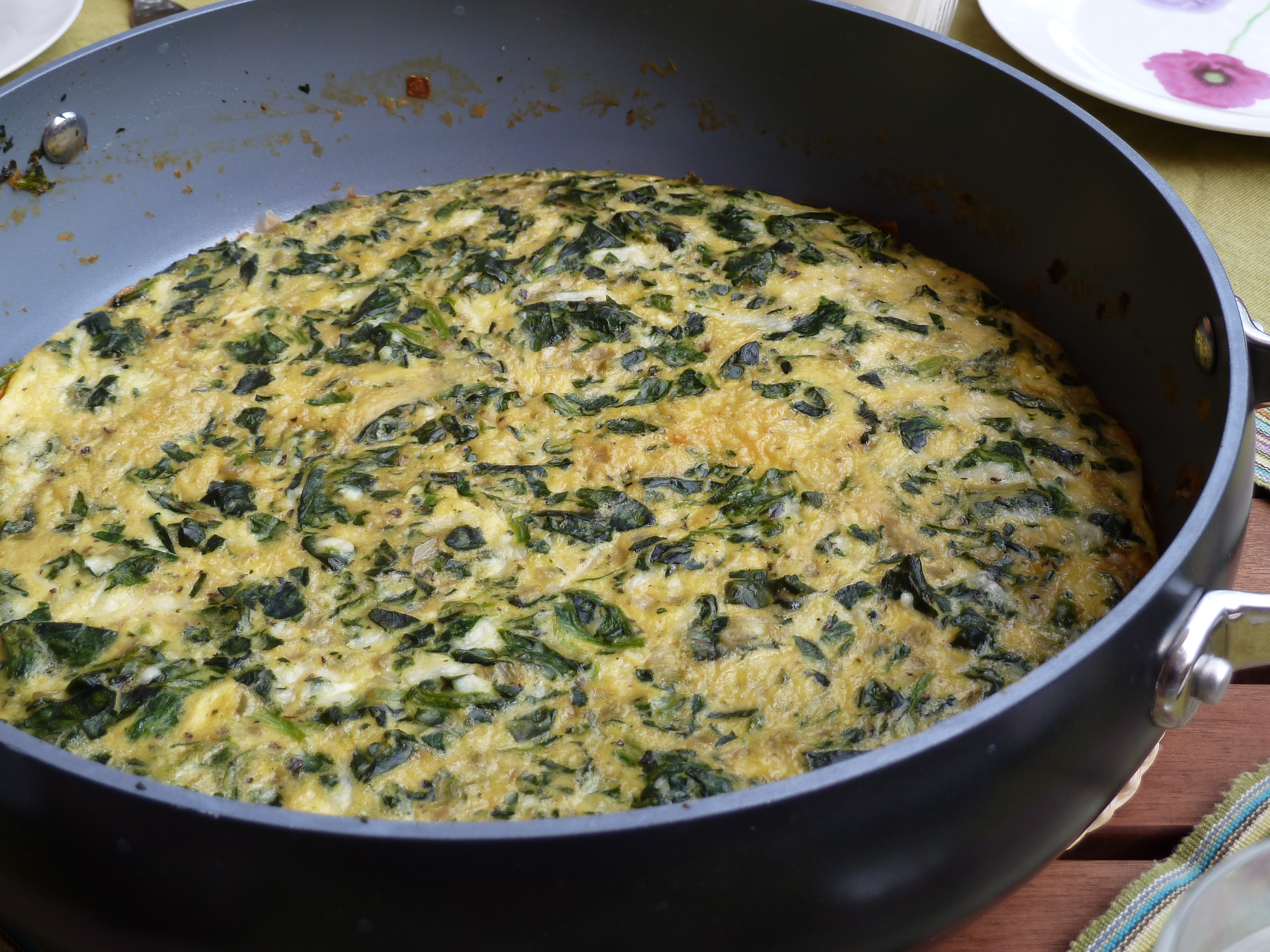 How to make: Saute the onions for five minutes. Add the frozen spinach and basil and chaute for another five minutes or until the spinach is soft. Add salt, pepper, and oregano. Mix the eggs with the Parmesan and add them to the pan. Stir well and let the food cook at low heat. When the edges are firm, place the pan under the broil for a few minutes to cook the top. Ready!