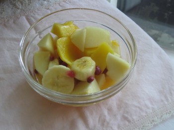 - 3 servings of fruit: 1 medium apple, 1 medium banana, 1 medium pear, 1/2 cup of blueberries, 1/2 cup of raspberries, 1/2 cup of strawberries, etc