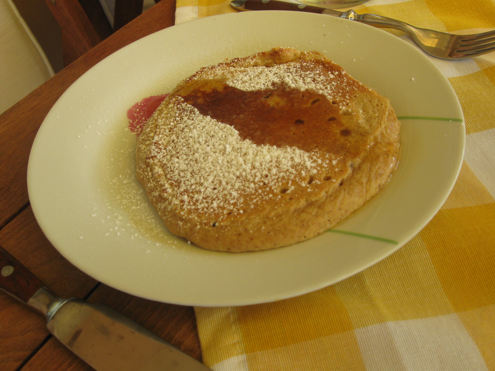 How to make: Mix in all the ingredients. Use a whisk. When the batter is nice and smooth use 1/4 cup to scoop batter and pour in heated pan. Wait until you see bubbles. Turn over and when remove when the other side is lightly browned. Repeat until you run out of batter. I served with confectioner’s sugar and maple syrup that I brought from the U.S.