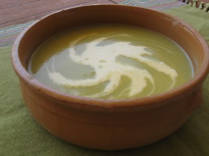 Do you know what’s great about the leek and potato soup? It’s as good in summer as it is in winter. The quality of its taste does not rely on being served hot you can enjoy it all year round. Today I’m serving it with heavy cream on top but you can keep the calorie count low without it and you won’t feel compromised. I originally got the recipe from Julia and Jacques Cooking at Home.