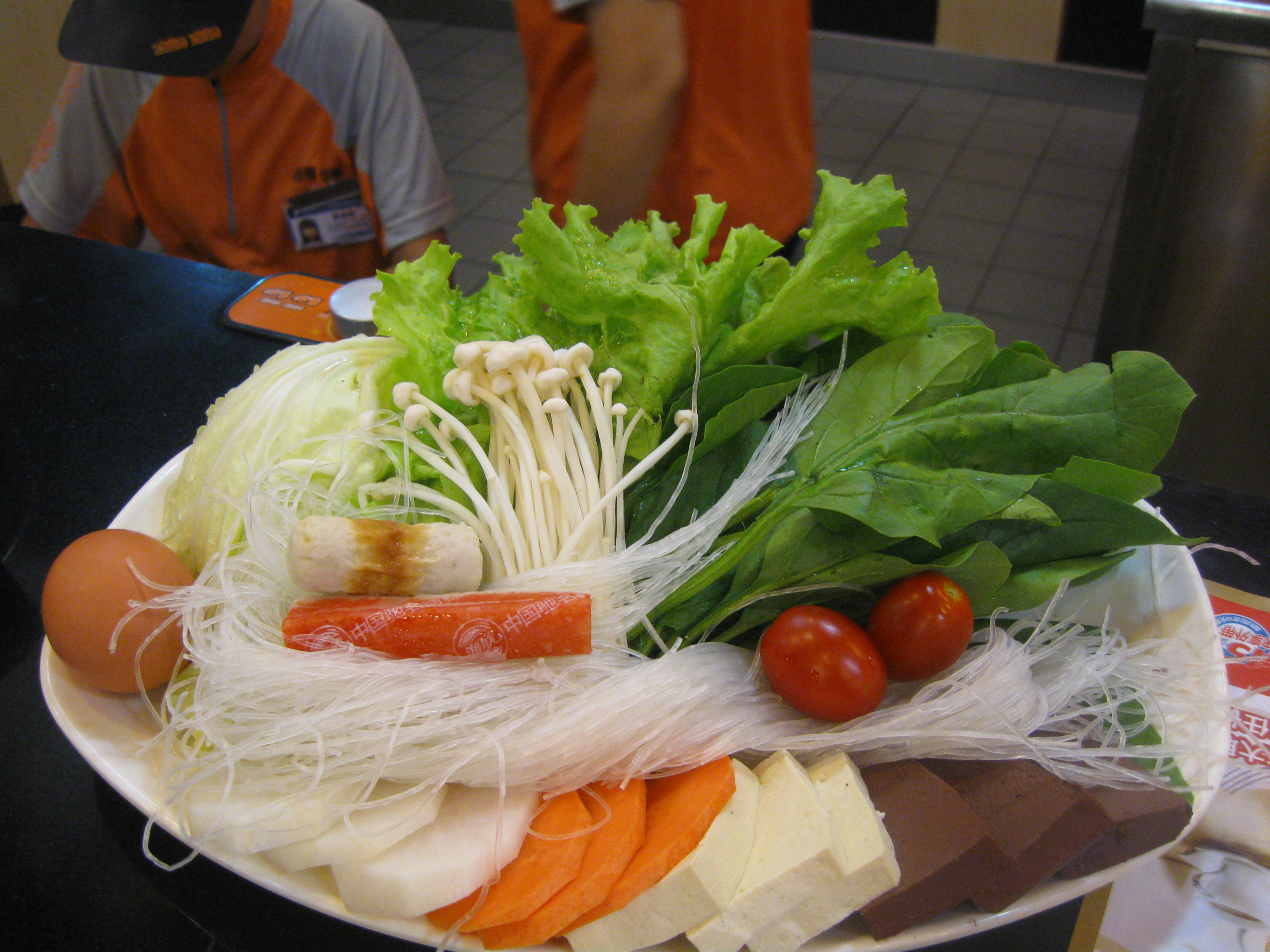 I can’t tell you exactly what I ordered to eat, as the menu was all in Chinese –was that an experience!– but I took photos to share. The vegetable tray included lots of green leafs, tofu, and and egg. You can see the collection close-up in the photo below. The meat plate had very thin slices of meat and we also ordered some noodles.