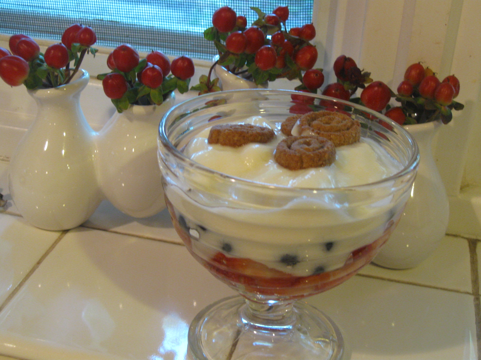 This versatile and beautiful bowl can be your favorite breakfast, snack, or even dessert. I introduced it to the family back in late spring and it’s become our favorite ever since. At different times and depending on what I find in my kitchen, I vary the fruit, –any two types among strawberries, raspberries, blueberries, blackberries, mango, pine apple, peach– the juice that wets the bottom fruit layer, the yogurt, –plain, vanilla, strawberry– and the toppings seeds, cereal flakes, all bran, chocolate chips, chocolate, flakes, candy sprinkles, or Trader Joe’s oat and wheat bran swirls that you see in the photo). Always enjoyable and a great healthy choice for dessert.