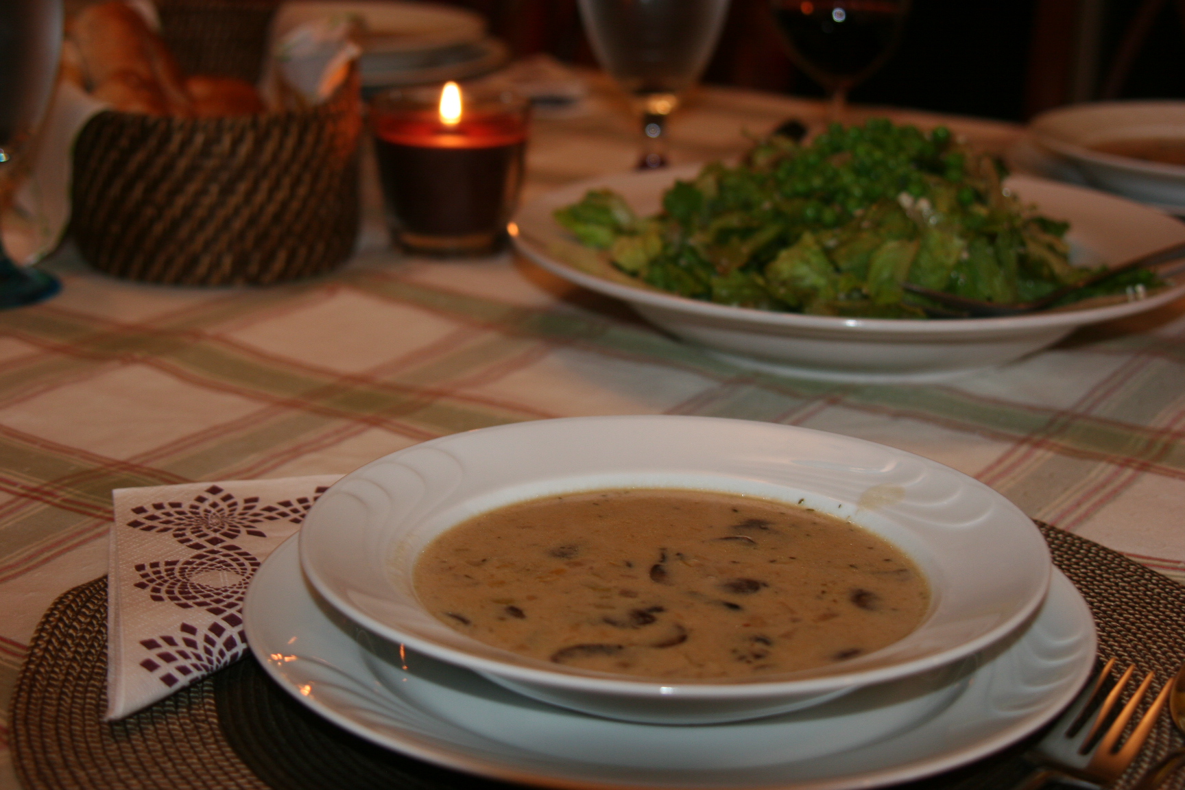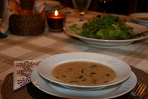Happy Halloween month everybody! It is Monday and Monday is a day to make special. My dinner today is mushroom soup and a green salad, beautifully served in our dining-room. Save the kitchen table for the other weekdays. My dinner today is served with wine –our favorite Skalani wine for this special day– juice for the kids and topped with bubbly stories from the school. Do you like our pumpkin? We carved it after dinner and saved the seeds to cook and enjoy tomorrow. Wishes for a rich harvest for all.