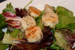 How to make: Wash the scallops and place them in a glass bowl. Mix them with the olive oil, garlic,  thyme, salt and  pepper. Let them stand for about 20 minutes. Coat a big pan with olive oil, heat well (high heat) and  saute the scallops until the become golden brown. About 2  minutes per side. I tossed the greens with a little vinaigrette and served with 3-4 scallops on top.  For the kids, I served the scallops on top  a bowl of pasta.