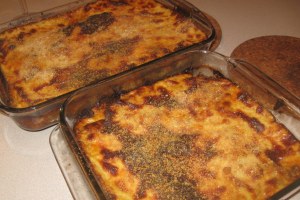 How to put it together: Cover the bottom of the pan with a thin layer of bread crumbs.  Arrange a layer of eggplant slices. Add a layer of zucchini slices. Add a layer of minced meat. Top with the bechamel. Sprinkle some bread crumbs and grated cheese on top and cook at a medium oven for about an hour.