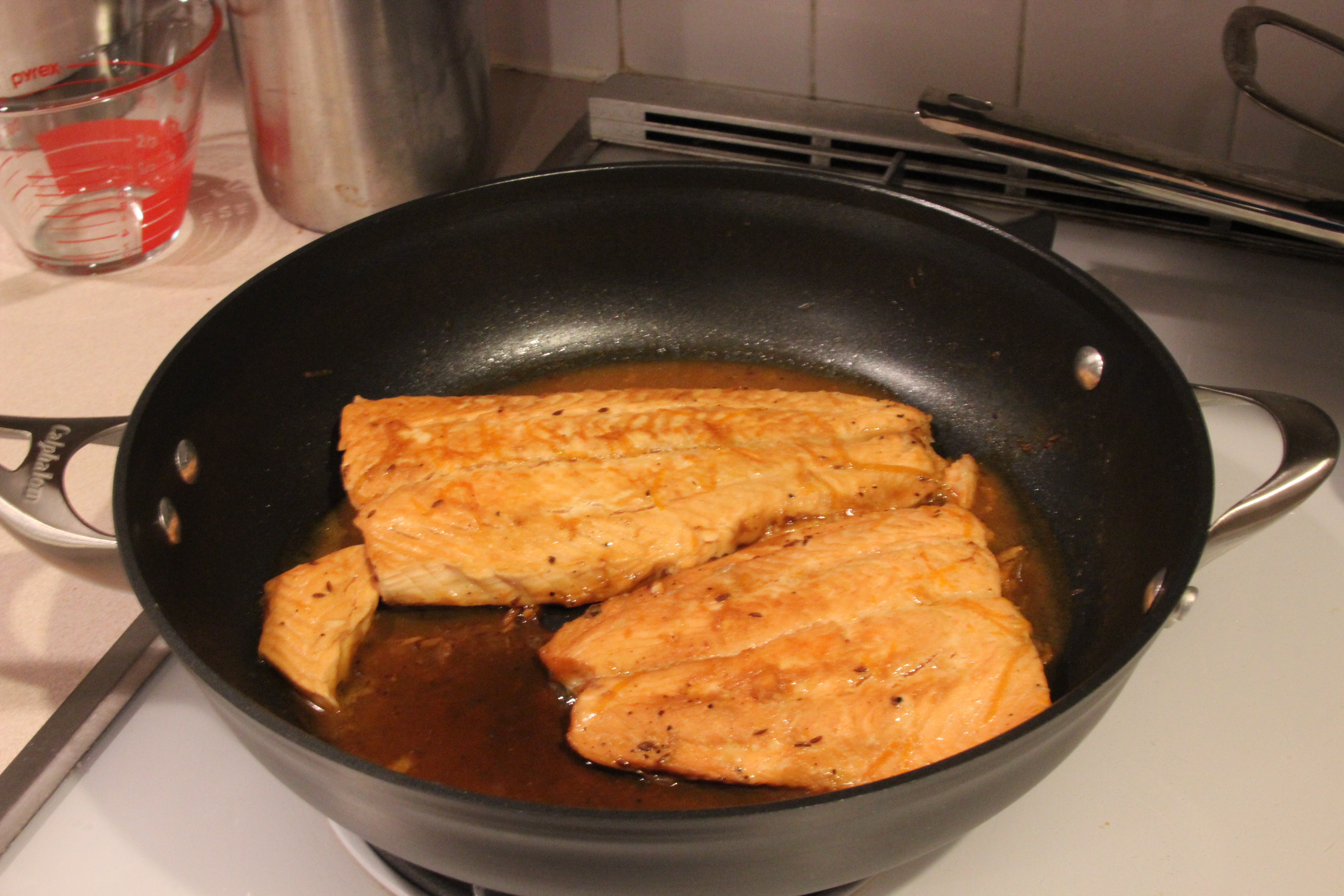 How to prepare: Place the fish in a glass container. Add the juice and zest from one orange. Peel a piece of the ginger root and cut in little rods, about 10. Cover the glass contained and let it stand in the fridge for several hours. When ready to cook, remove the fish from the marinade and pat dry the side with the skin. Heat a heavy skillet at high heat and place the fish in with the skin down. Let it cook for a minute or two. Add the soy sauce, flip over, add then, add the juice of two oranges (not from the marinade), orange zest, the ginger rods, and pepper. Turn the heat low, cover the pan and cook for about 10 minutes or until you can easily detach a flake from the fish using a fork. Ready!