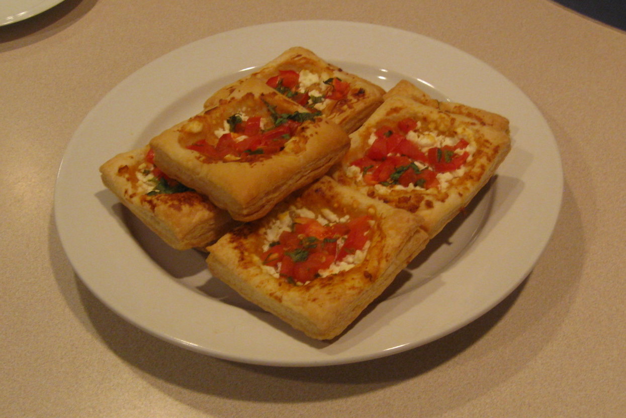 How to make: Put the puff pastry squares in a baking sheet (about 6 fit in mine). Brush ketchup like you’d spread butter on your bread. Put a tablespoon or more of cubed tomates in the middle of each square. Some salt optional. Add a teaspoon or more crumbed feta cheese on top and top it off with the parseley or oregano. Bake in pre-heated oven (390 F) for about 40 minutes or until the pastry gets a nice golden color. Remove from the oven and put the next bunch.