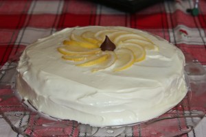 To make the fluffy frosting, beat the cream cheese (at room temperature) with the confectioner’s sugar and lemon juice until nice and smooth. Gradually add the milk and the envelope of instant lemon or vanilla pudding. You can stop adding when you get the consistency you need. Cover the cake with the icing and decorate. My decorated is simple. A Hershey’s kiss in the middle and very thin slices of lemon. If you have the energy (I didn’t), remove the lemon from the slices and use just the peel. You’ll need more slices but it’ll look very nice.