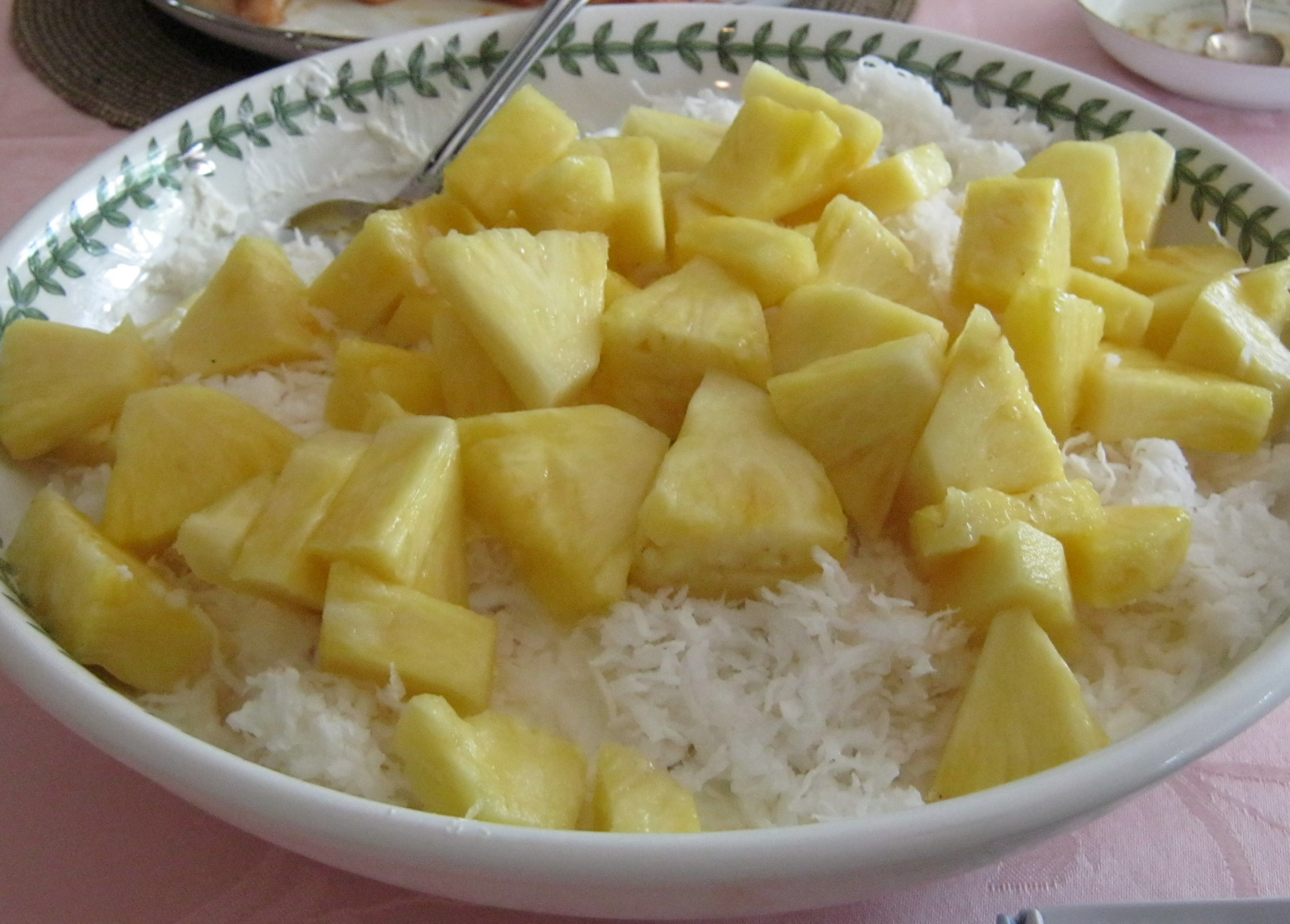 We have a couple of coconut shells at home that we saved from ice-cream we bought served in coconuts. Here’s our wonderful ambrosia, topped with coconut and served in a coconut!