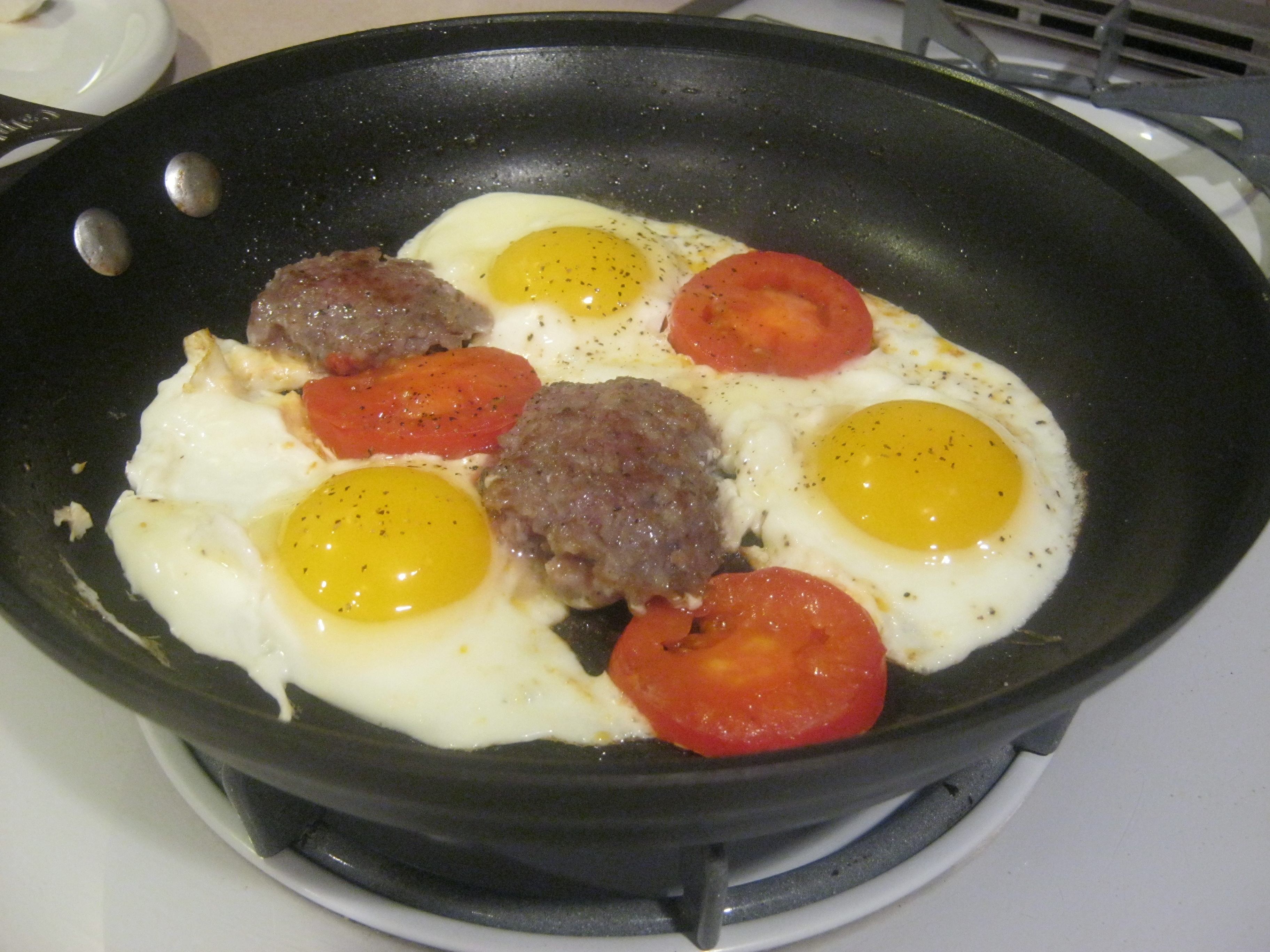 How to make: Heat the butter and cook the sausage. Save the cooked sausage in a plate. Add the tomato slices and let them cook. Crack three eggs and add the sausage. Tiny bit salt, depending on the saltness of the sausage and the feta cheese, and pepper. Let the ‘saganaki’ cook at low heat until the eggs settle. Sprinkle with feta cheese crumbles and serve.