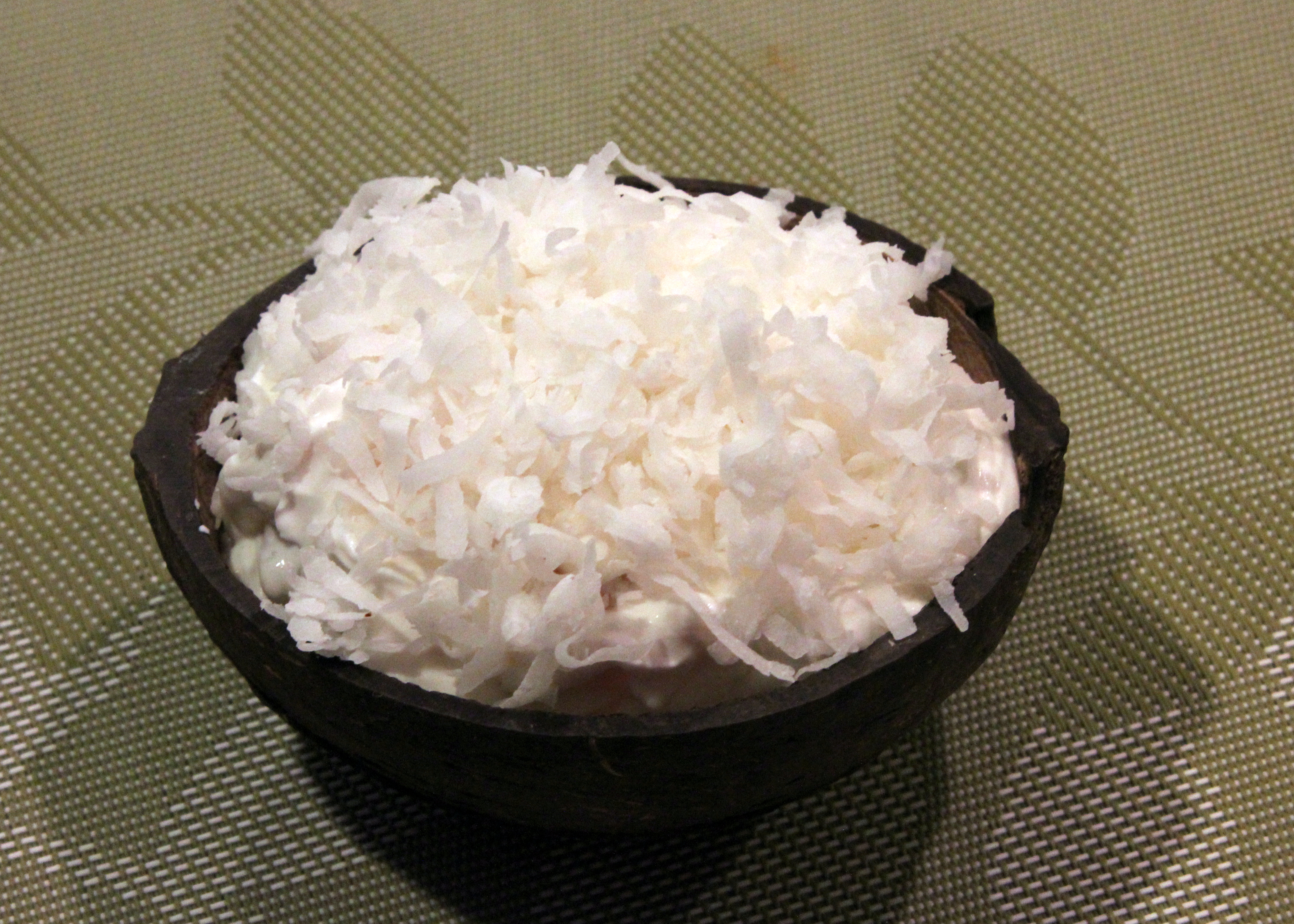How to make: Combine the yogurt with the chantilly and lemon zest and keep in the refrigerator. In a big serving ball combine the pine apple with the grapes and orange bits. When you are ready to serve, add the sliced bananas, mix all the fruit with the yogurt and chantilly and cover with a layer of coconut.
