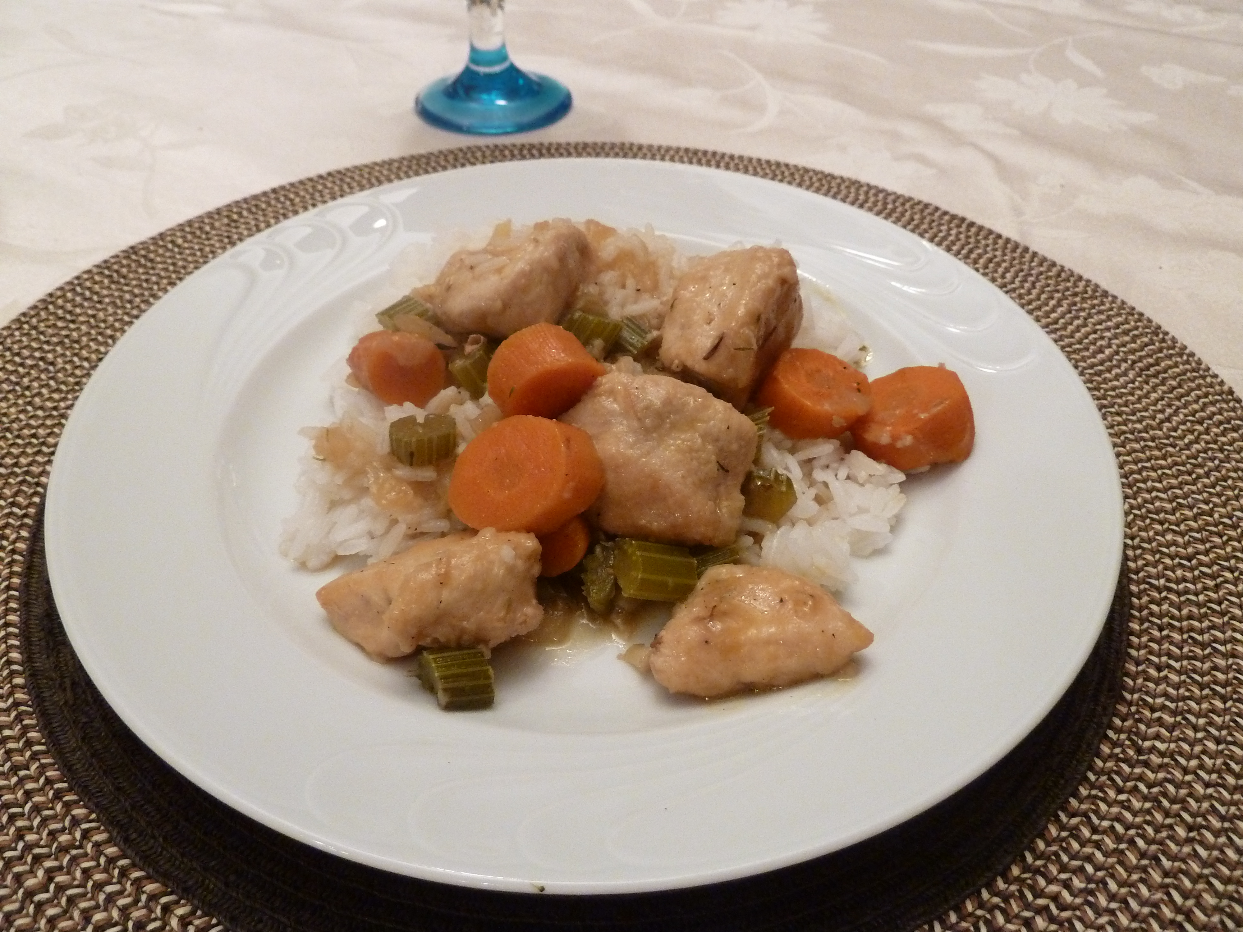 How to make: Wash the chicken breasts, cut them in cubes and add salt & pepper. Coat them lightly with flour. Heat the butter in a heavy skillet and brown the chicken cubes. Take them off the skillet and let them stand while continuing with the veggies. Saute the onion, celery, carrots and garlic until soft, about 5 minutes. Add the wine and cook for a few more minutes. Put the chicken cubes back in the skillet, add the bay leaves and chicken broth. Cover and cook for about 30-40 minutes. Serve with jasmine rice.