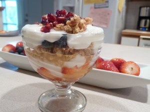 The last holiday recipe has been posted, the last holiday treats are gone. Time to return to a much healthier but no less enjoyable routine.  Make a layer of fresh, well-rinsed, cube-cut strawberries. Add a tablespoon of orange juice. Add a layer of  vanilla yogurt and a layer of granola with dried berries. Top it with more yogurt and fruit. I was lucky to have pomegranate seeds in the fridge.  Blueberries, blackberries, raspberries, bananas, mango, and pine-apple are all very tasteful variations. Plain yogurt or strawberry yogurt, also, awesome. Pick your favorite yogurt, fruit, and granola and go!