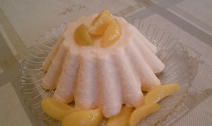 How to make: Skin the peaches and mash them using a food blender. The softer the peaches, the better.  Mix the peach pulp with the heavy cream, yogurt, and sugar. Mix well until you get a smooth texture. Pour the mix in a container (preferably metallic) and let it in freeze in the freezer for 6 hours. When you want to serve it, dip the container in hot water for about a minute and flip it over in a serving dish. Serve with fresh peaches or peaches in syrup from a jar.