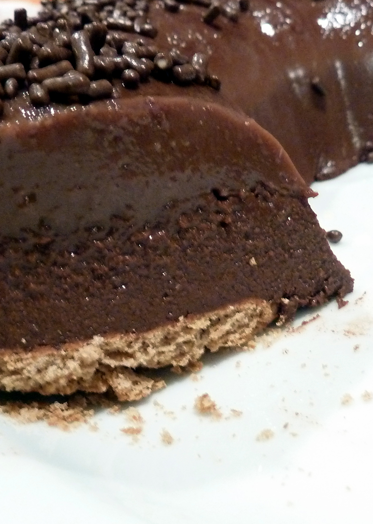 How to make: Let the gelatin dissolve in a small bowl with about 3 tablespoons cold water. In a saucepan, heat the milk with the sugar. When the milk is hot, take the sauce pan off the fire and add the chocolate chips. Stir until the chocolate has melted and is well-integrated. Add the gelatin and mix well. If you have dissolved gelatin sheets, squeeze them dry first to let excess water drip and then add it to the saucepan. Put the jello in a baking pan. Let it cool a bit until it become a little firm. Add a layer of biscuits and refrigerate for couple of hours. I used a silicone pan so, flipping it over was quite easy. For other pans, you will need to dip them in hot water for 30 seconds before flipping it over. I, actually, hate doing that which is why I have equipped my kitchen with silicone pans. Your call!