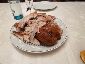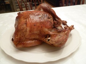 How to make: Wash the turkey well and tie its legs. Apply salt and pepper generously. You can reach under the breast skin and put some salt and pepper there, too. Place the turkey on a rack in pan. Melt the butter. Saturate a piece of cheesecloth in the butter. Cover the turkey with the cheesecloth. Add a cup of water or a cup of beef broth in the pan. Add some rosemary, thyme, or other flavorful herb in the water. Now cover the turkey with aluminum foil forming a kind of hat around it. Make sure the foil does not touch the turkey. What you want is to cook the turkey in the steam that the water will generate and the foil will trap. Cook the turkey in a 375F/190C oven for about 4 hours. Mine was 19 pounds and it took 5 and half hours to cook. About an hour before it’s ready, remove the foil and the cheesecloth to allow the turkey to brown. Baste the turkey with the liquid from the bottom of the pan. When it is ready, take it out of the oven and let it sit for a few minutes. When you cut the turkey, add some more pan liquids to the cut pieces in lieu of gravy. Ready!
