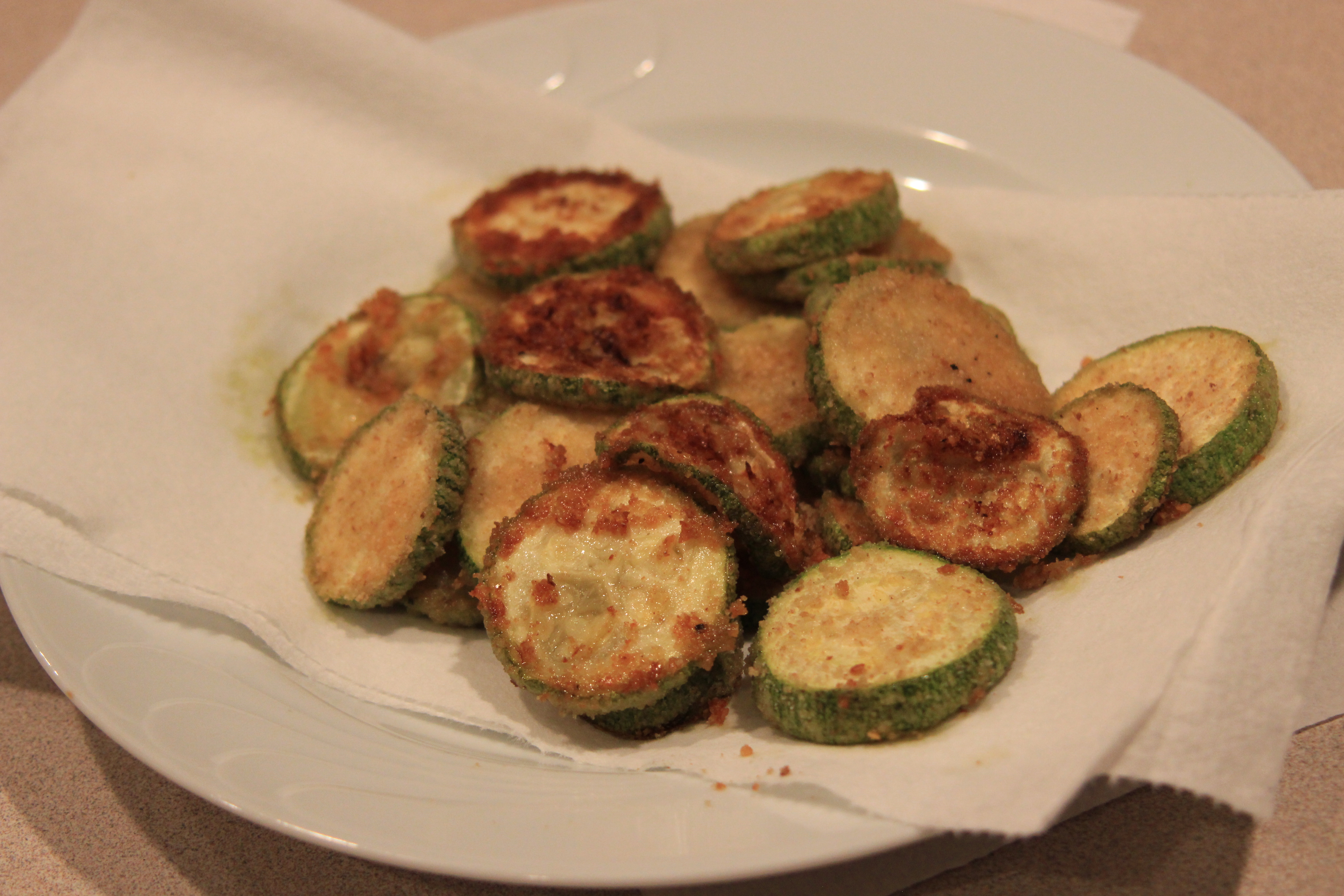 How to make: Wash, pat dry, and slice the zucchini. In a bowl or plate, put some olive oil and roll over the zucchini so they get a nice coat. Add salt and pepper. In another bowl, combine grated Parmesan with bread crumbs. Roll over the zucchini so they get a nice coat and arrange them flat on a slightly oiled pan. Pre-heat the oven at 375F/190C and cook until they are nicely browned, about 20-25 minutes.