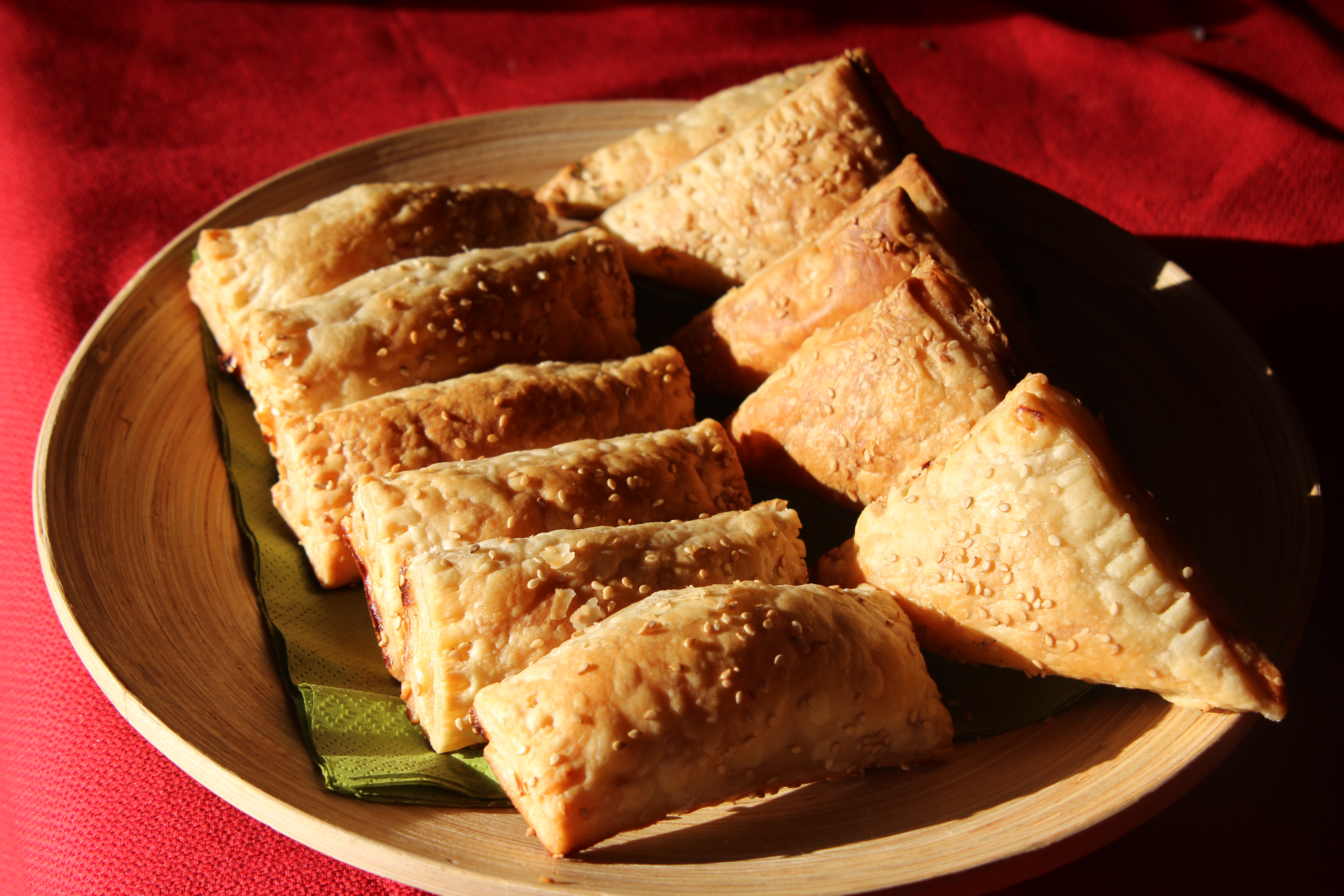 These pies were made using the core of the zucchinis used for stuffed zucchini. The filling of the pie is exactly the same as the filling of the zucchini pie posted before on mydinnertoday. This time I didn’t have time to make the hand-made dough so I used puff pastry squares to fold in spoonfuls of the zucchini filling. Some of them I folded in triangles and I rolled the rest for variety. There was still some dough left. I filled couple of ramekins with the leftover dough and threw them in the oven. See the photo at the end of the post. Didn’t they come out great! Zucchinis are awesome whatever you do with them.
