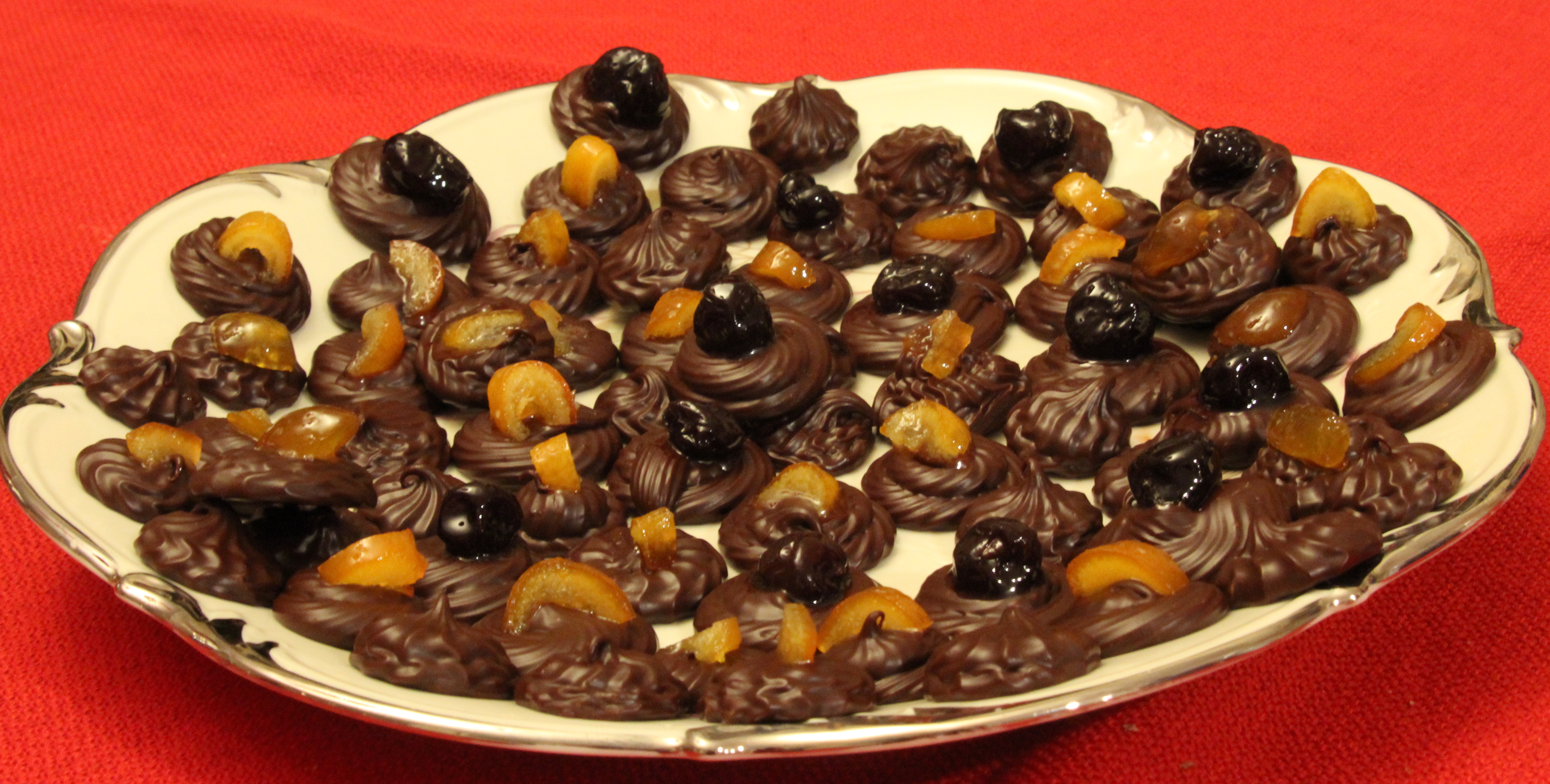 How to make: Fill the bottom pan of a double boiler with water, half-way. Pour the sweetened milk in the top pot. Vicky’s recipe suggests one can but that was not enough for my chocolate so I added two. You may want to start with one, especially if you use more milky chocolate. When the milk is heated, add the chocolate and stir until it’s melted. Let it cool off just slightly. Fill a dessert decorator with the chocolate, pick your favorite decoration tip and squeeze chocolate bits on a pan. I lined mine with silicone pads but you can use parchment paper if you don’t have silicone pads. Cut the “spoon dessert” fruits in small pieces and stick them on top. I sliced the oranges and kuquat but not the cherries. Put the chocolates in the fridge for couple of hours and serve! Keep the rest in the fridge.