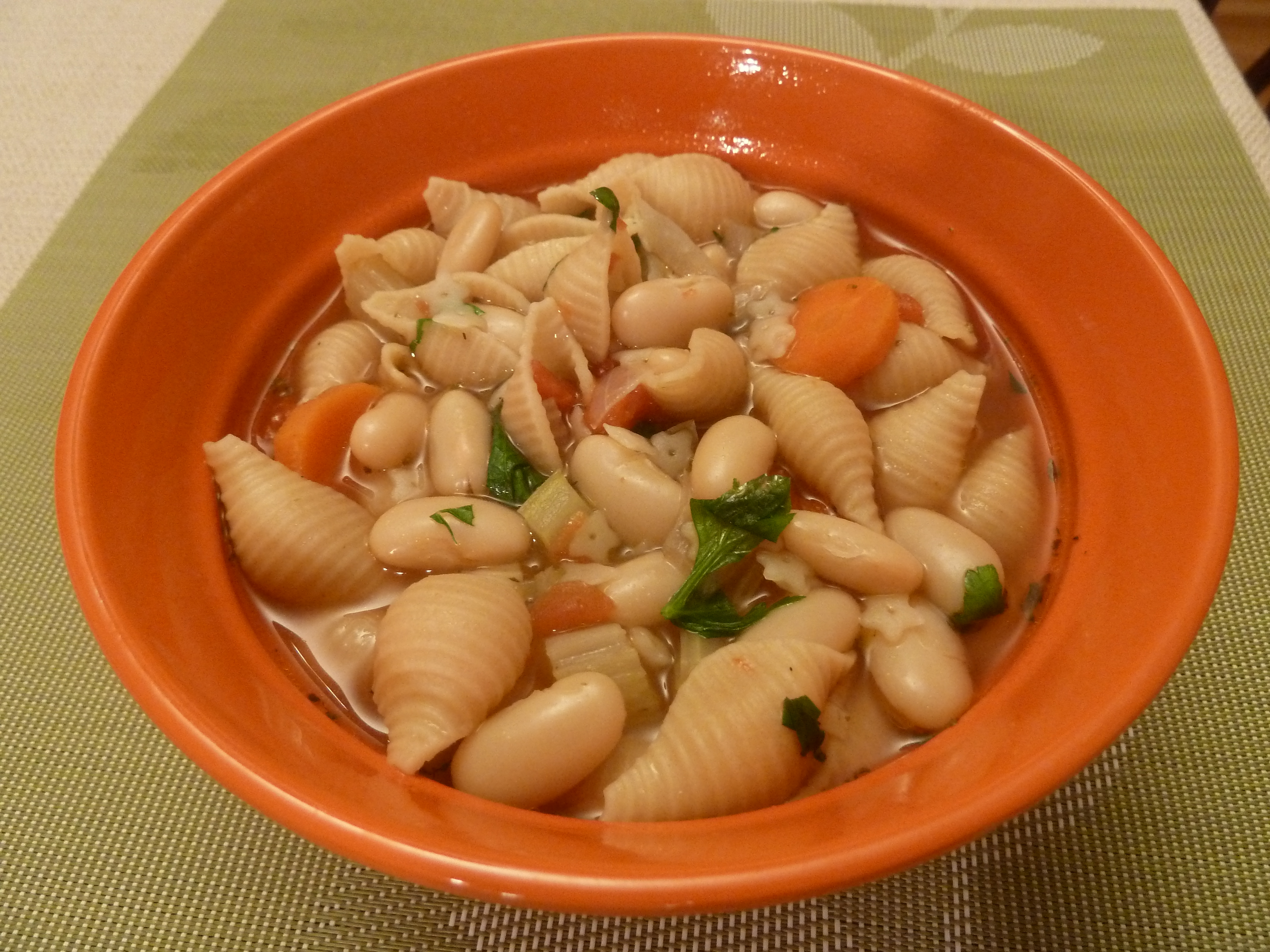 How to make: In a big pot, heat the oil. Saute the onion until it becomes clear. About 5 minutes. Add the garlic. Add the chopped carrots and celery stalks. Add the seasonings and cook for about 5 minutes. Add the broth and the tomatoes. Season to taste with salt and pepper. Bring to boil and add the pasta. Cook the pasta according to packet instructions. Two to three minutes before the pasta is ready add the beans and cook for a few minutes. Take the pot off the fire.